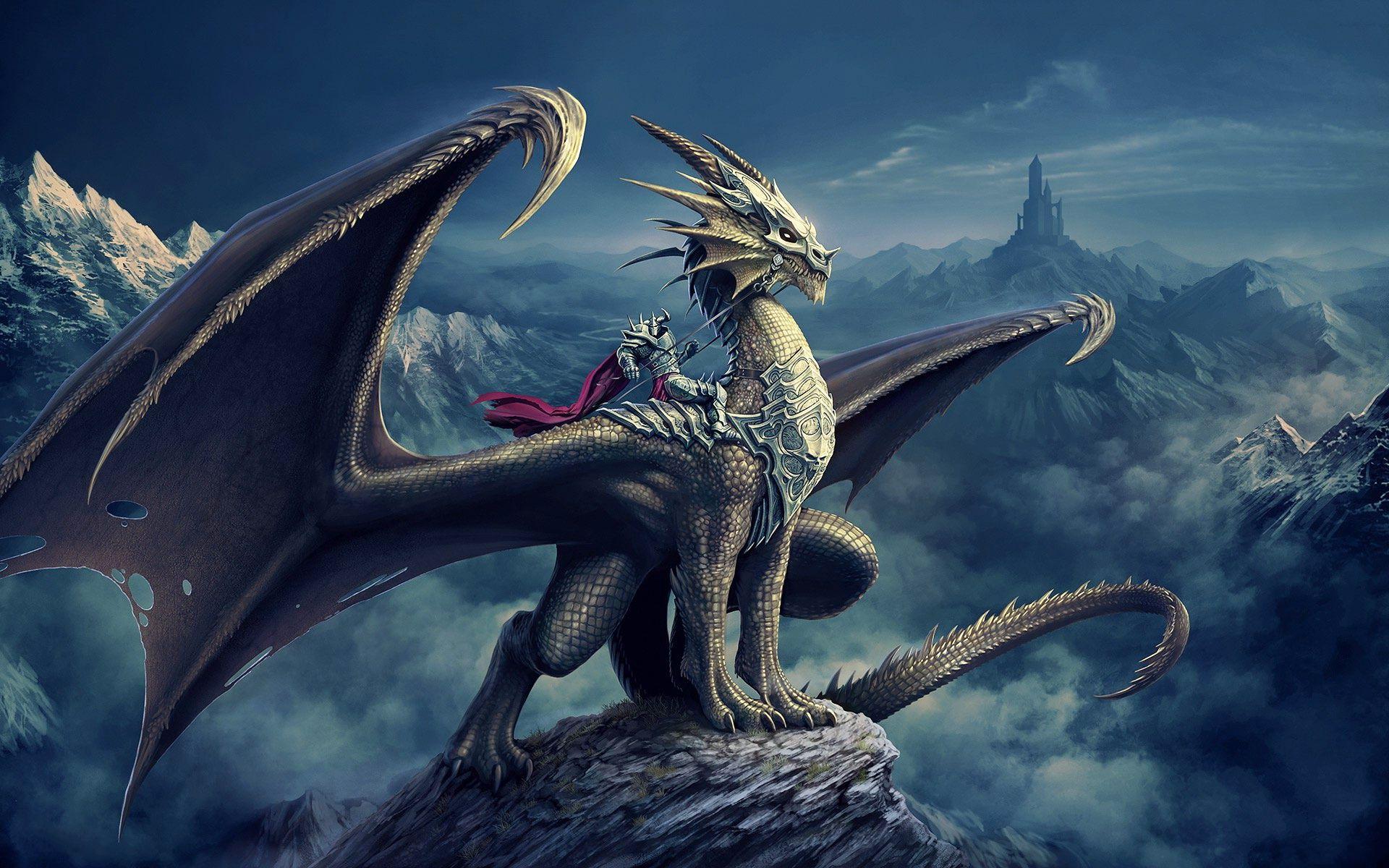 Description: A dragon with a red cape on top of a mountain with a castle in the background and a mountain range in the background.