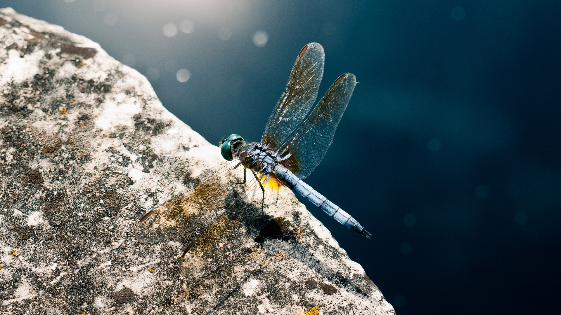 Description: A dragon flys over a rock in the water of a lake or lake with a sun shining on it.