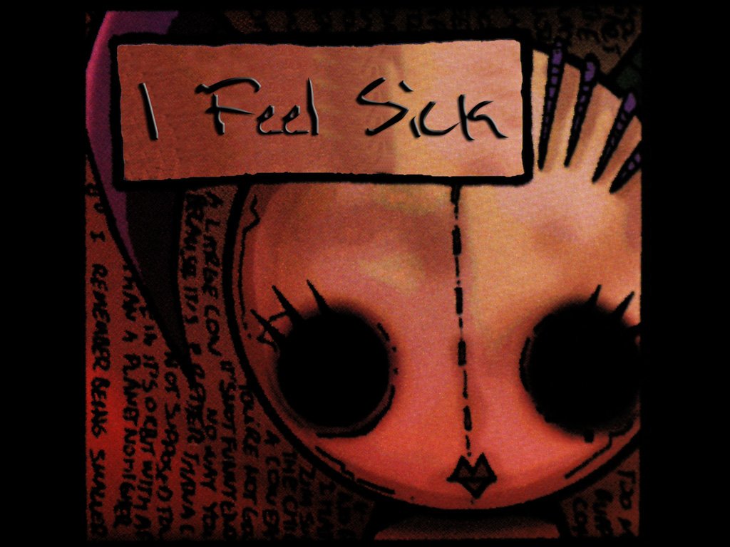 Description: A drawing of a face with a sign that says i read sick on it's forehead and eyes.