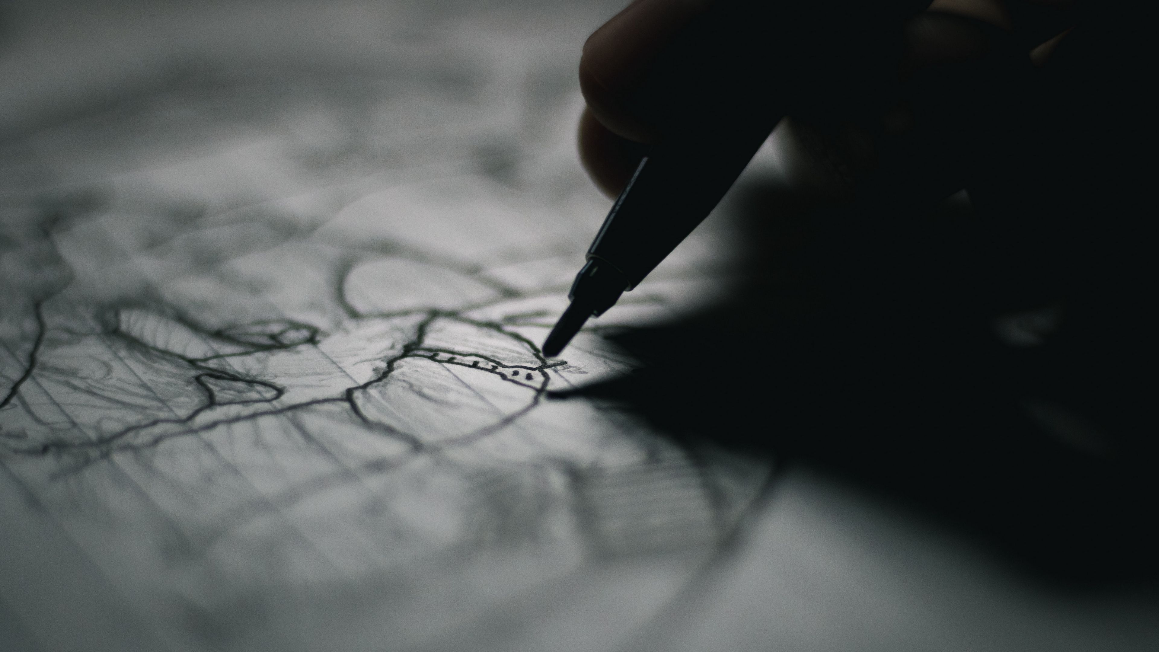 Description: A person is drawing a picture with a pen on paper with a black pen on it and a black pen in the foreground.