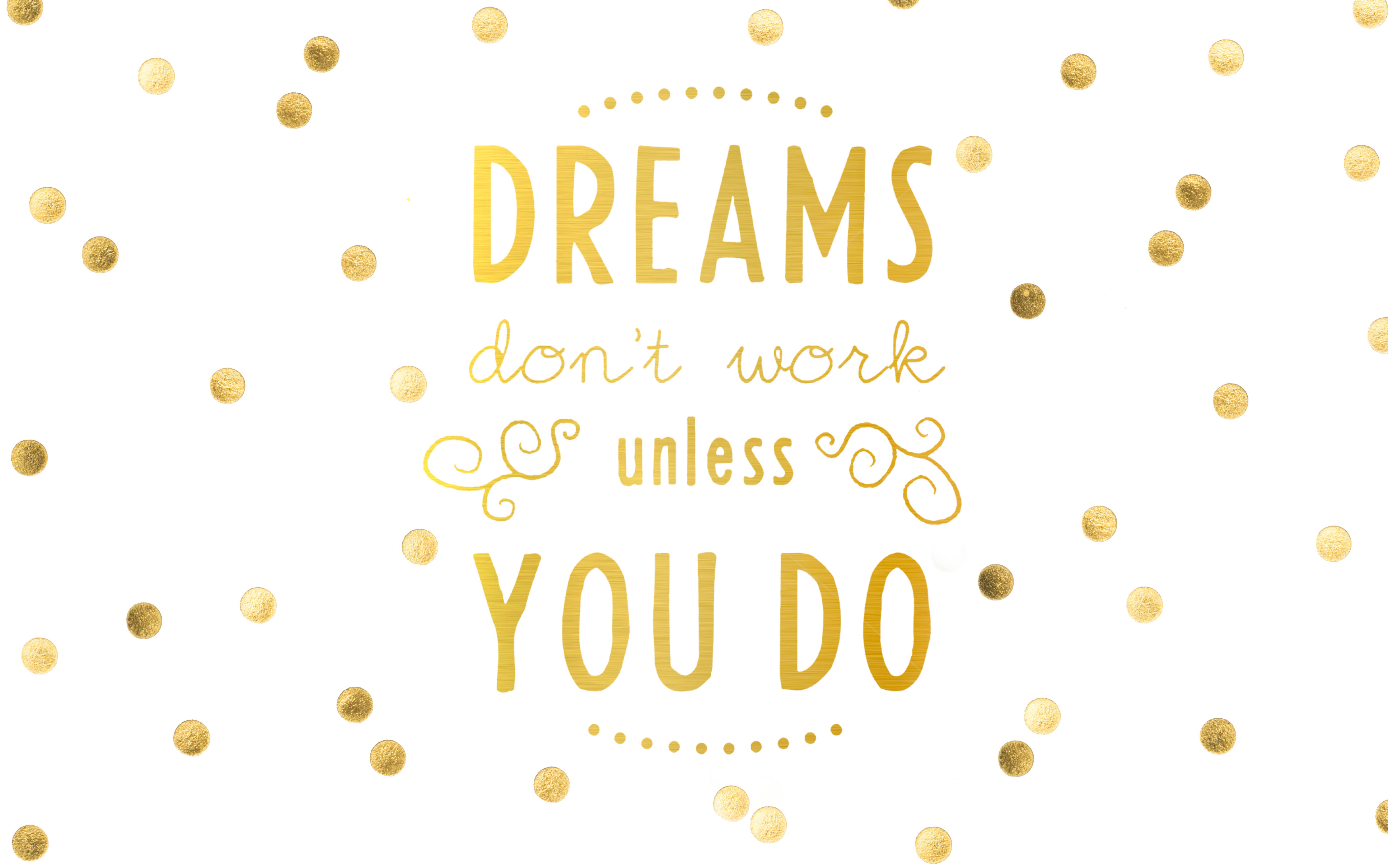 Description: A quote that says dreams don't work unless you do on a white background with gold dots and a circle.