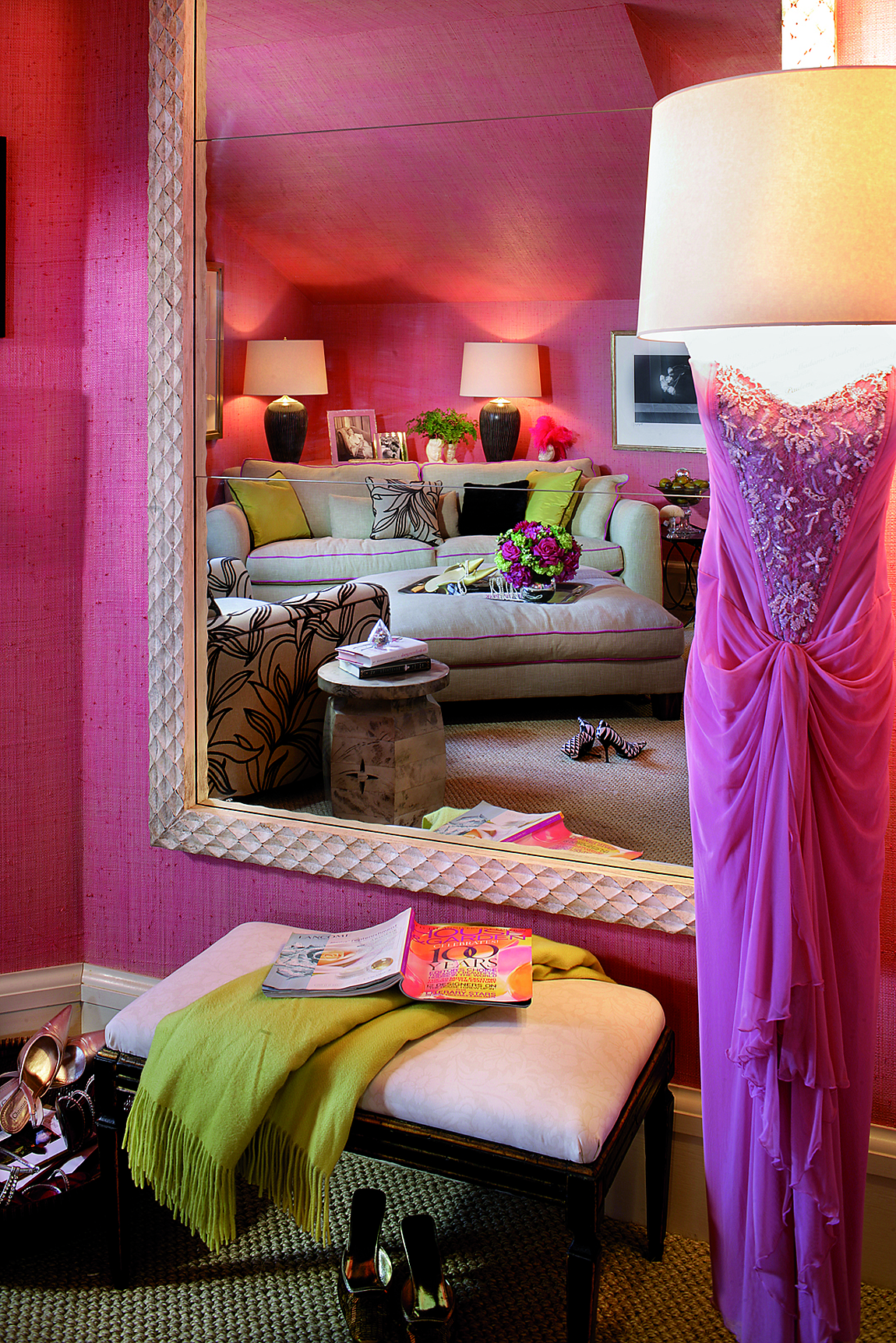 Description: A dress is hanging in a room with a mirror and a lamp on a table in front of a couch.