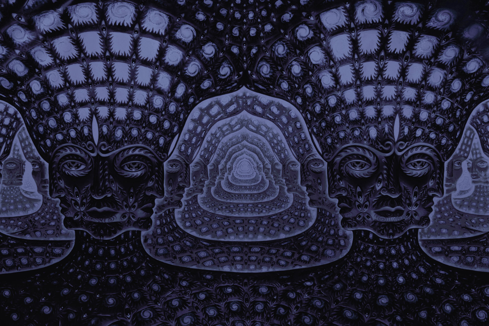 Description: A group of people with their faces covered in water droplets and a black background with a blue hued image of a face.