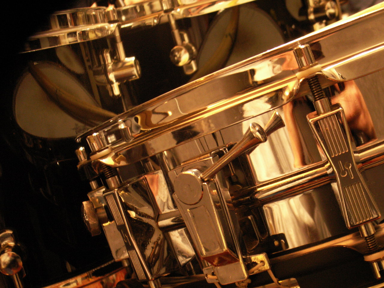 Description: A close up of a drum set with a person playing the drums behind it and a black background behind it.