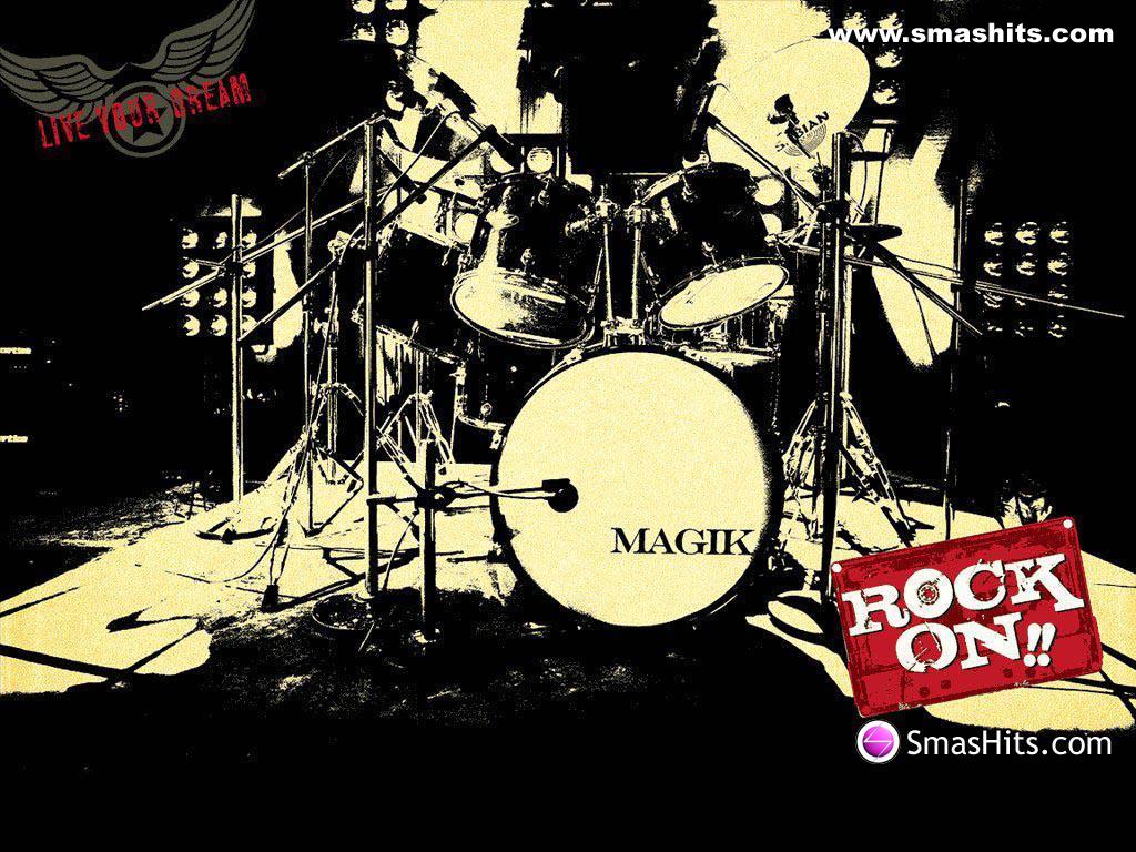 Description: A drum set with a rock on sticker on it's side and a sign that says rock on.