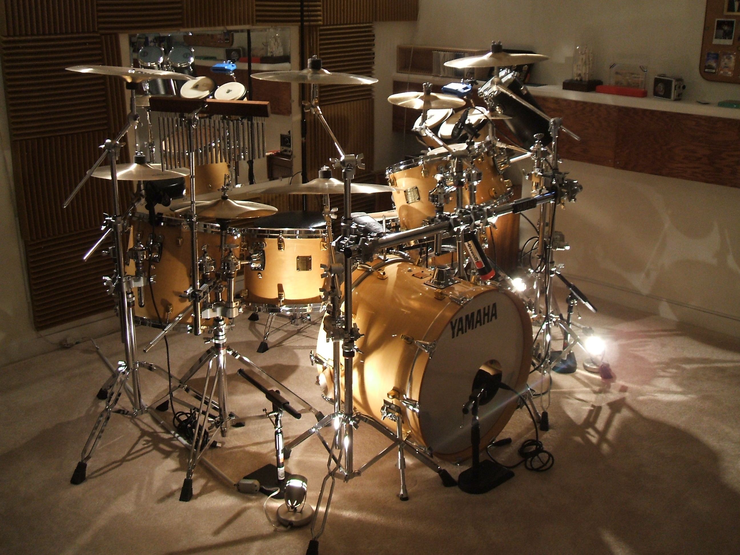 Description: A drum set is sitting on the floor in a room with a window and a shelf behind it that has a mirror.