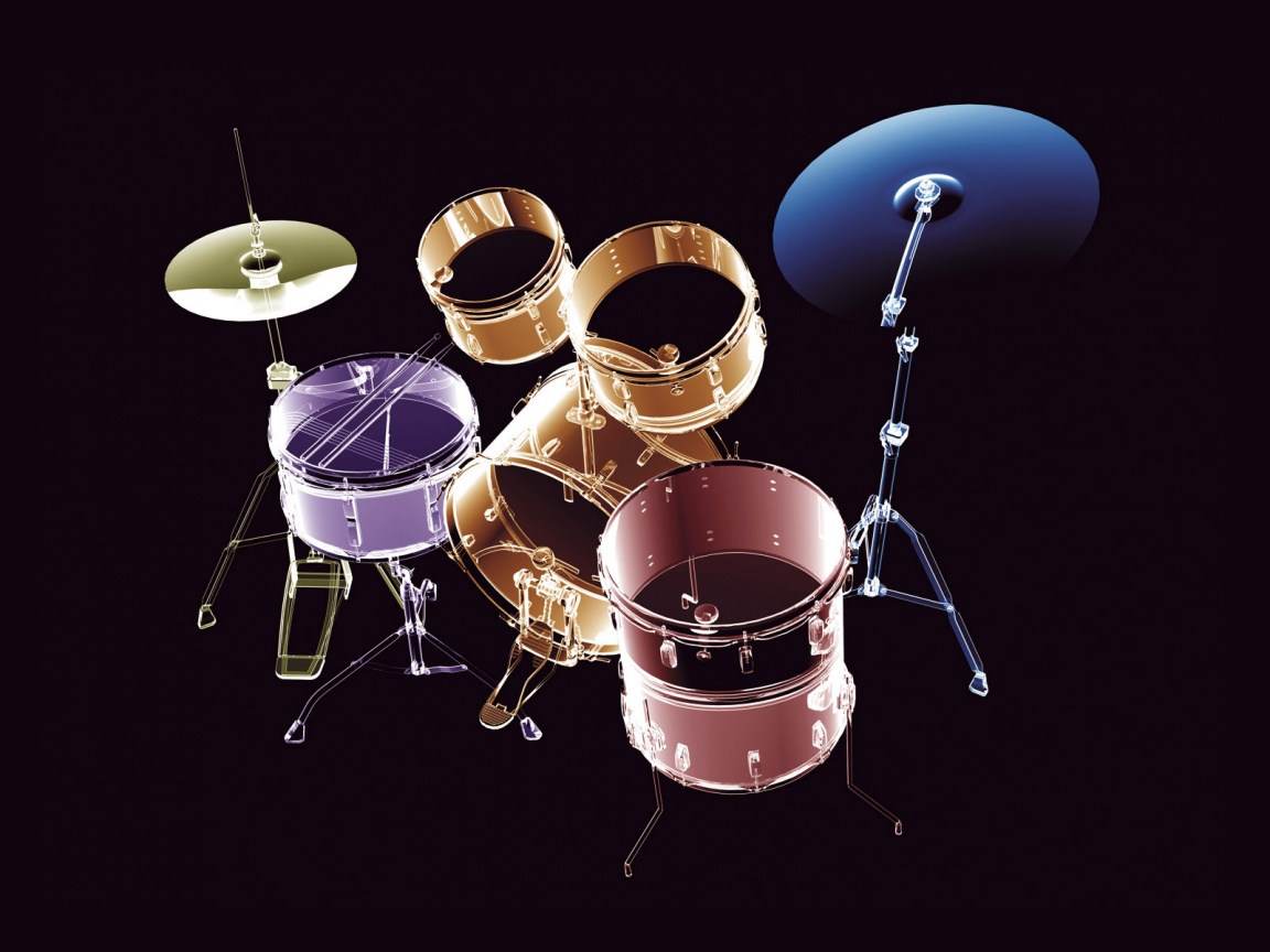 Description: A group of drums and drumsticks sitting on top of each other in front of a black background.
