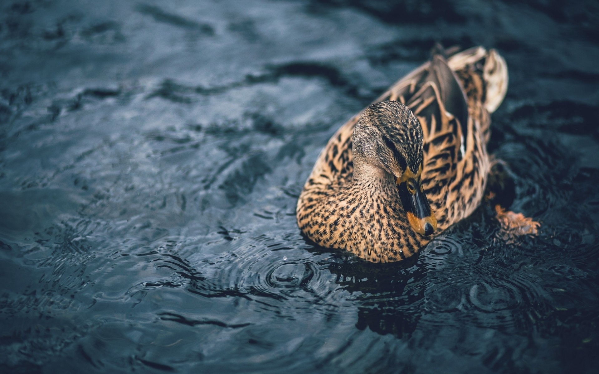 Description: A duck is floating in the water on a dark surface with ripples on the water and a black background.