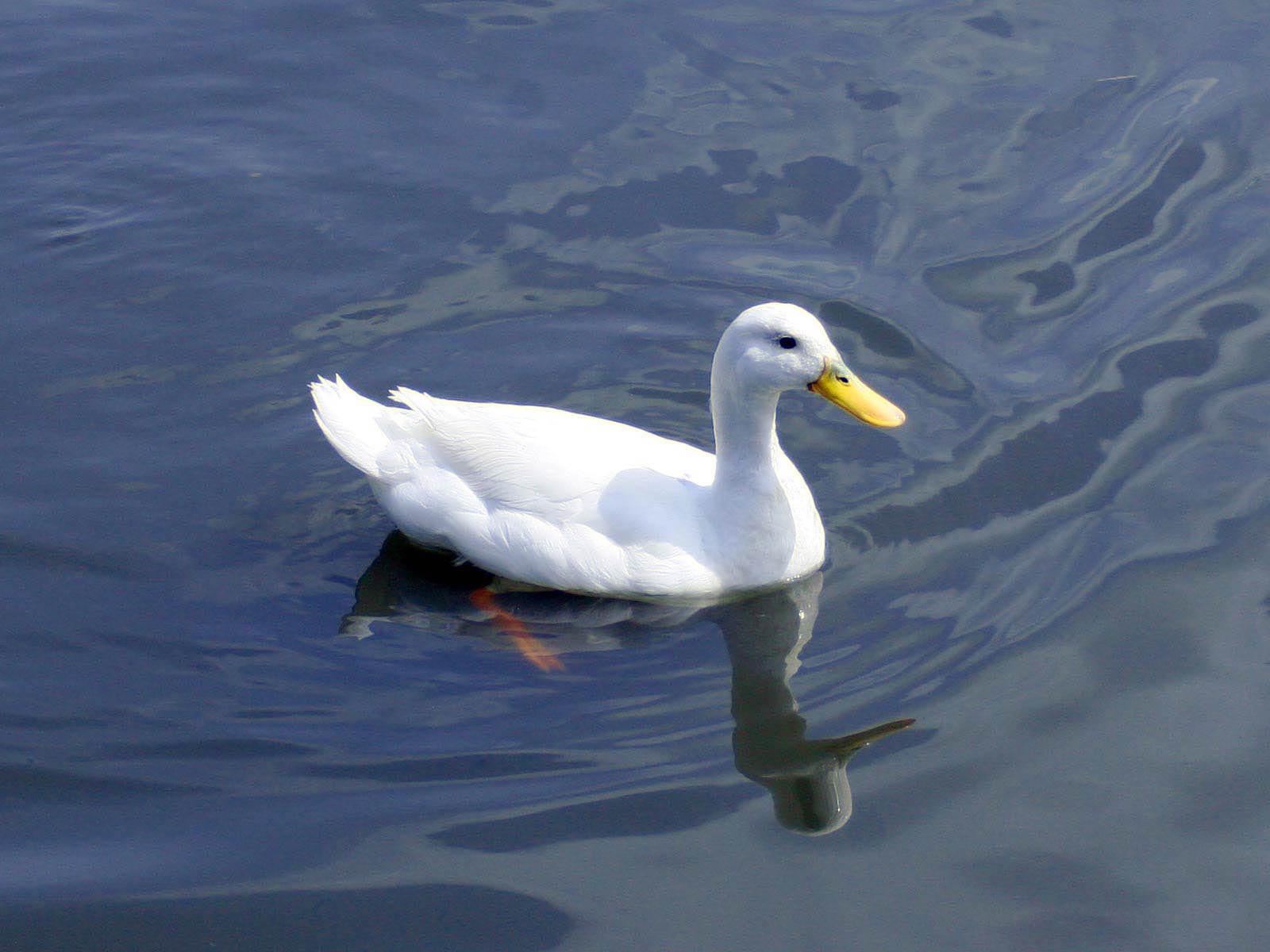 Description: A duck floating on top of a body of water next to a shore line with a yellow beak and yellow bill.