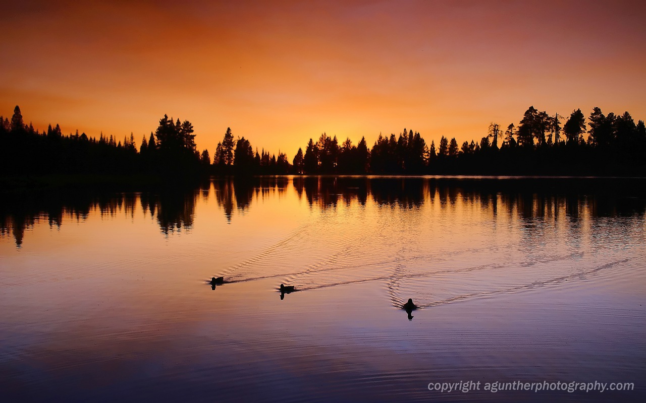 Description: A couple of ducks floating on top of a lake at sunset with trees in the background and a sunset sky.