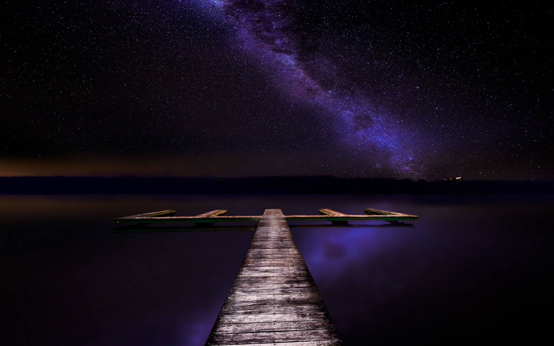 Description: A dock with a long exposure of the milky in the background and a dock in the foreground with a dock in the foreground.