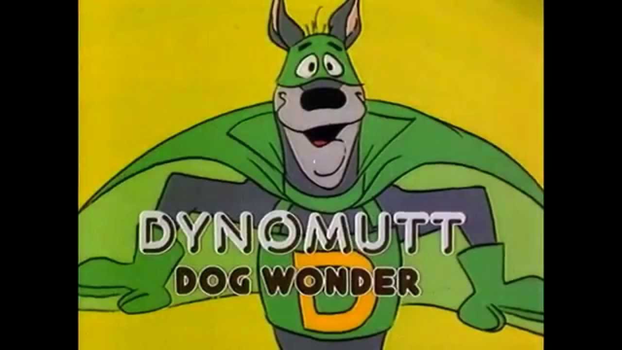 Description: A cartoon character with a green cape and a yellow background with the words dynomutt dog wonder.