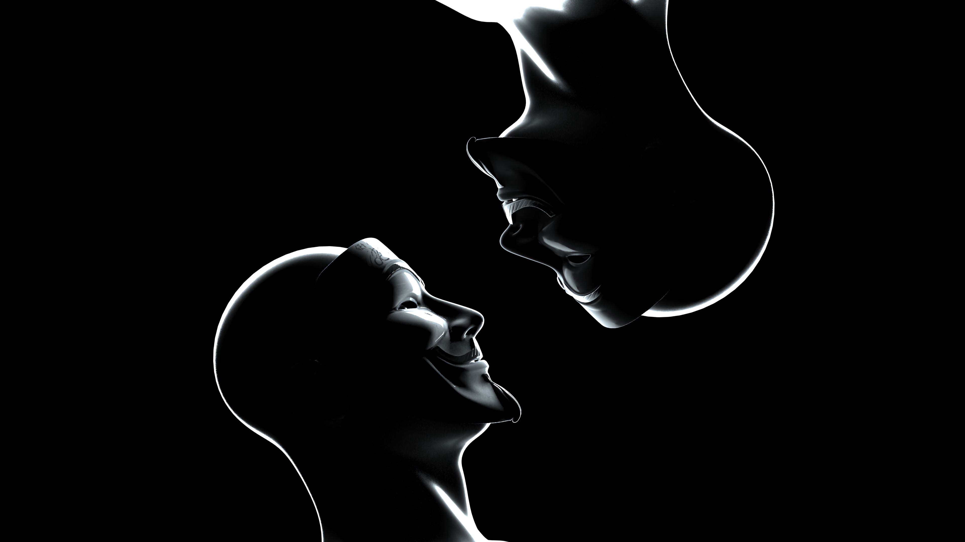 Description: A couple of people that are looking at each other in the dark with a moon in the background of them.