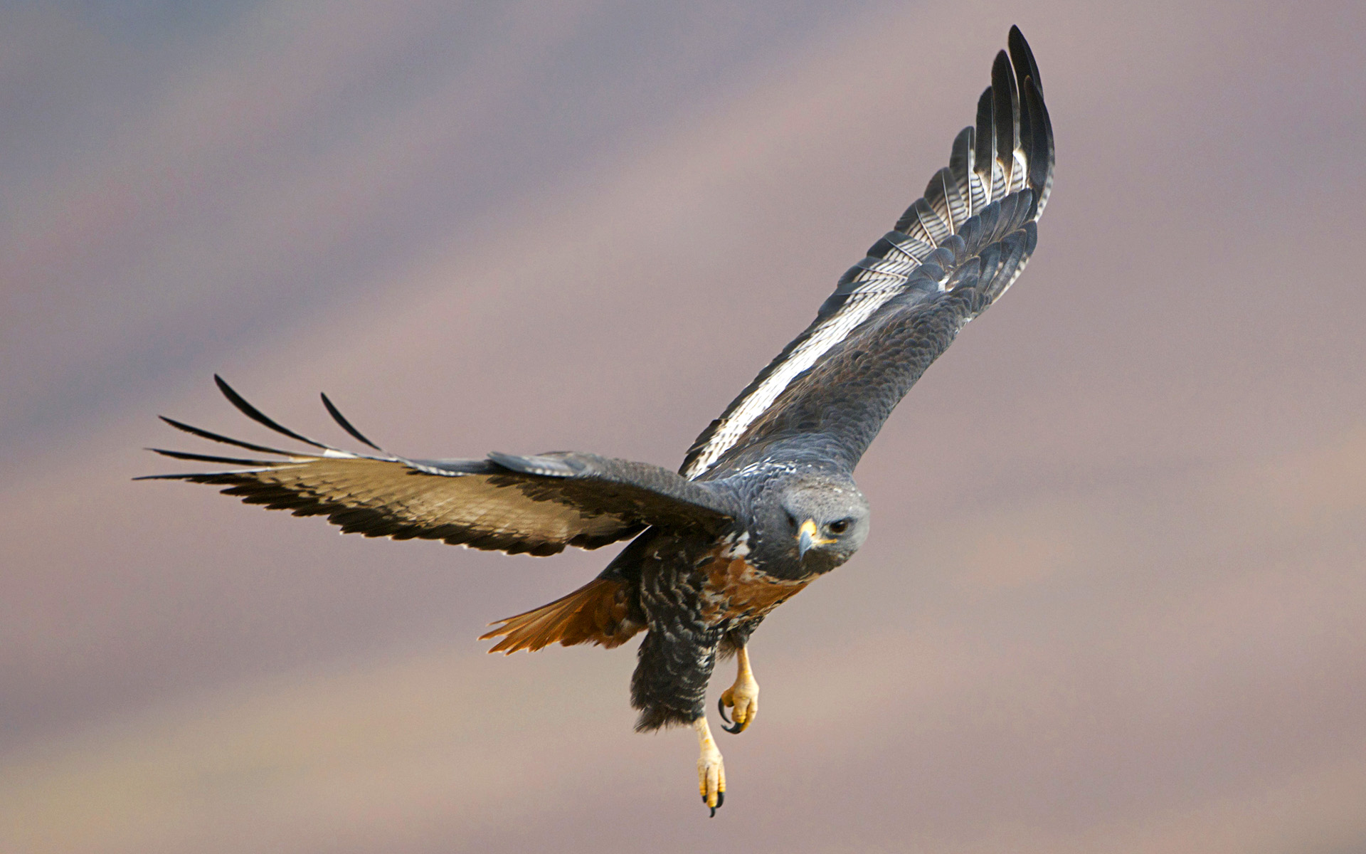 Description: A bird of prey flying through the air with its wings spread out and it's head down and wings spread out.