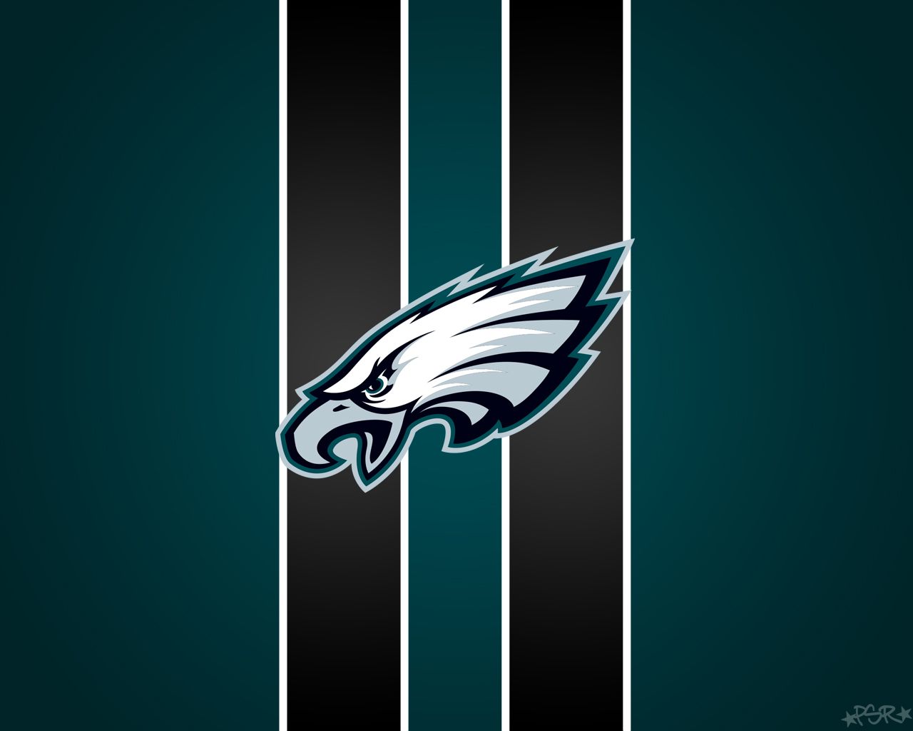 Description: The philadelphia eagles logo on a black and white striped background with a green and black stripe in the center.