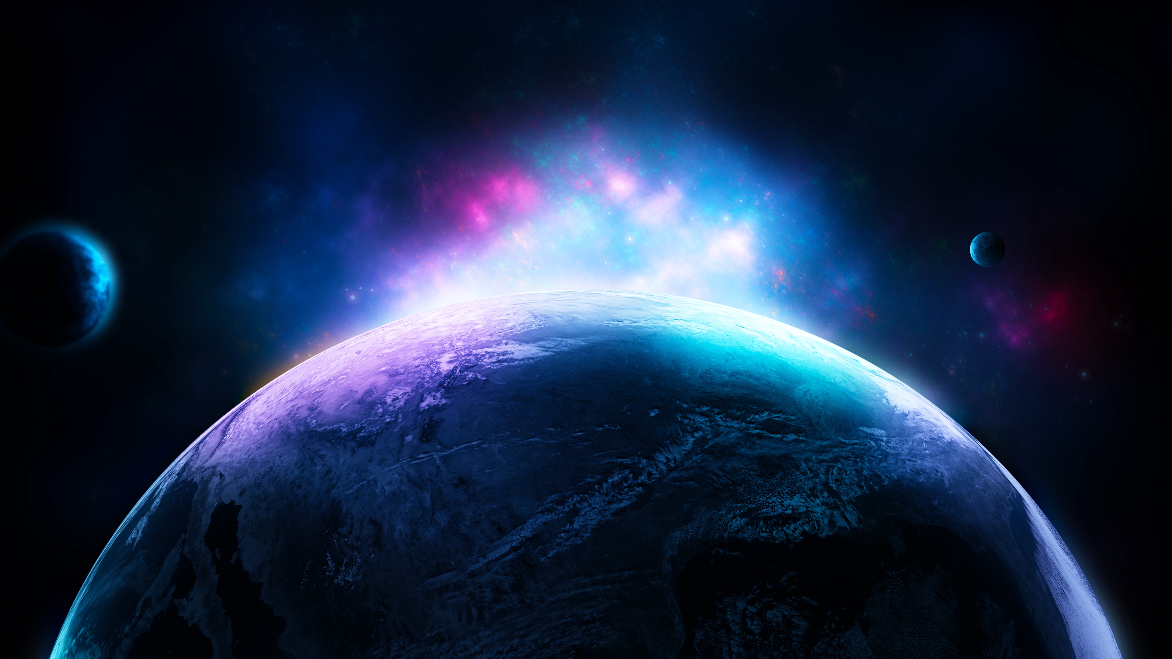 Description: A view of the earth from space with a bright light coming from the center of the image and a distant star in the background.