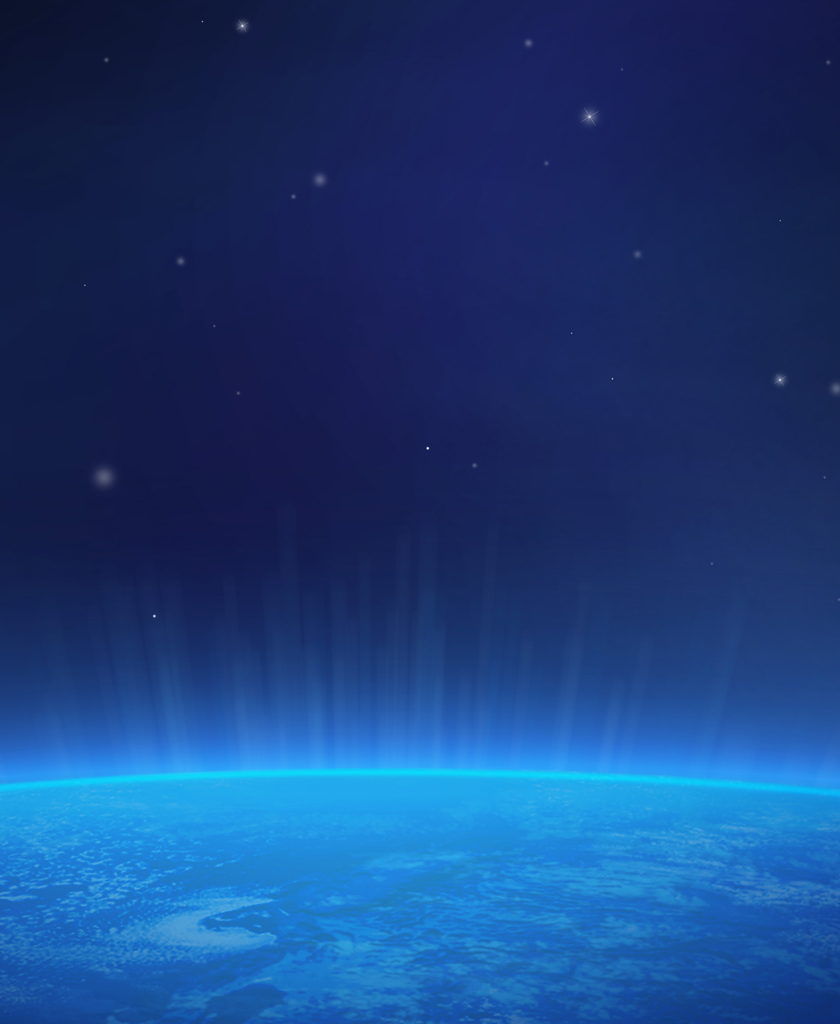 Description: A view of the earth from space with bright lights shining down on it and stars in the sky above.