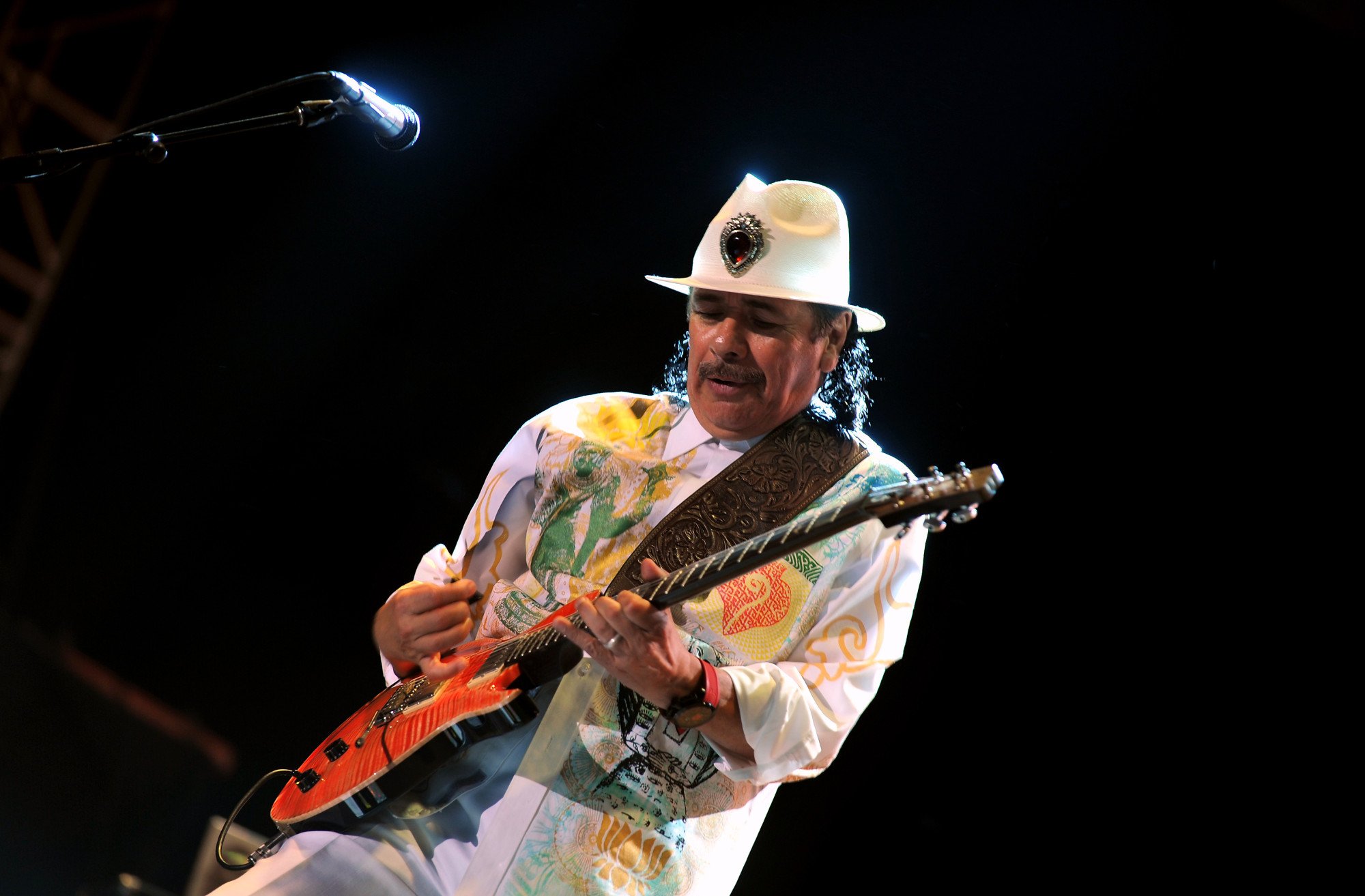 Description: A man with a white hat playing a guitar on stage with a microphone in the background and a microphone in the foreground.