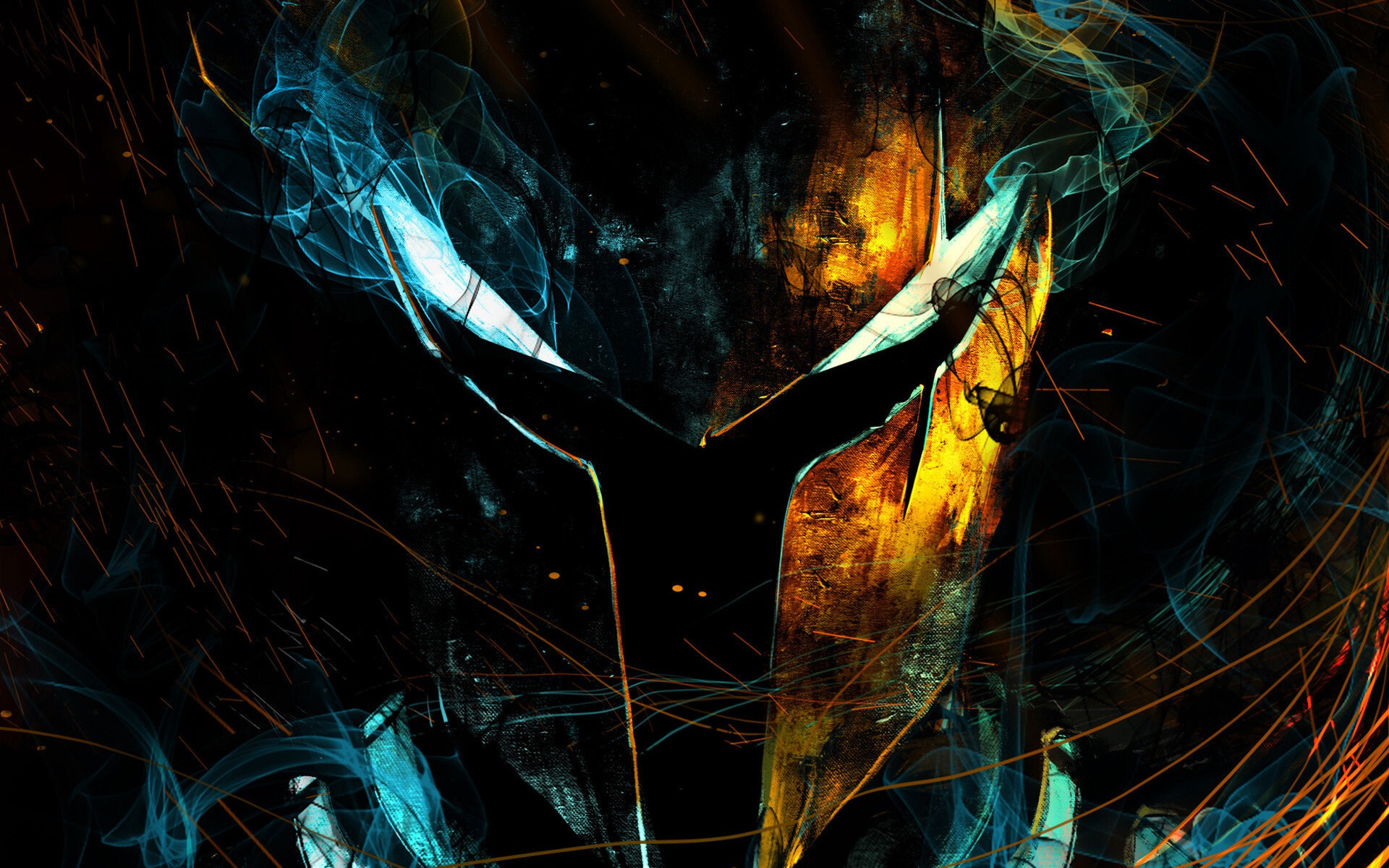 Description: A computer generated image of a man's face with a glowing background of blue and yellow lines and smoke.