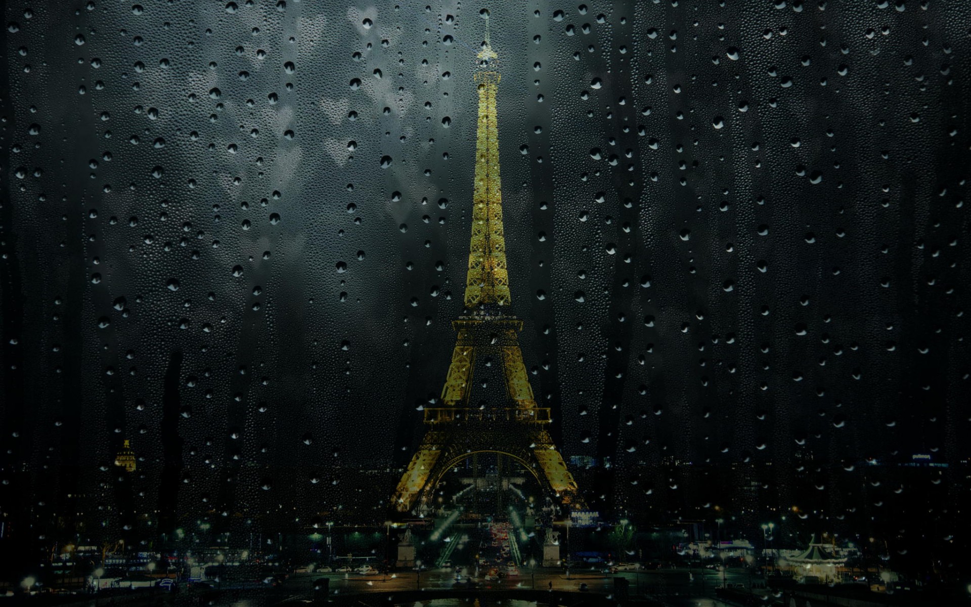 Description: A view of the eiffel tower through a rain covered window with rain drops on it and a dark sky.