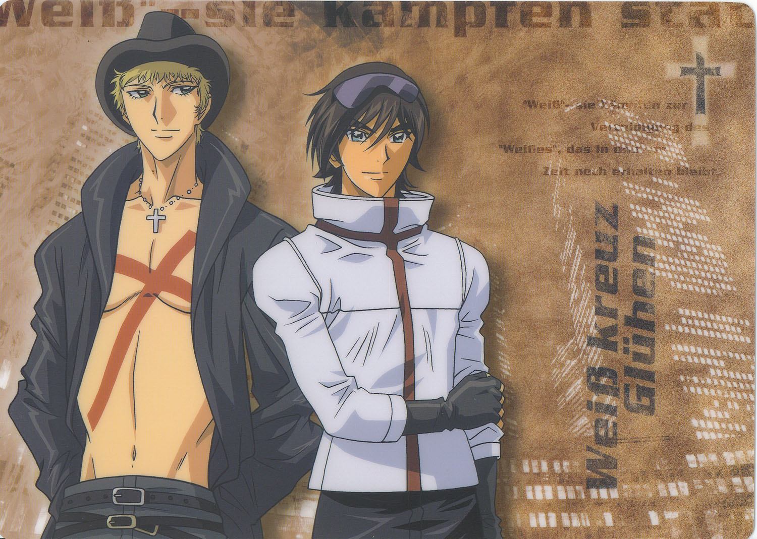 Description: Two anime characters standing next to each other in front of a wall with a cross on it's chest.