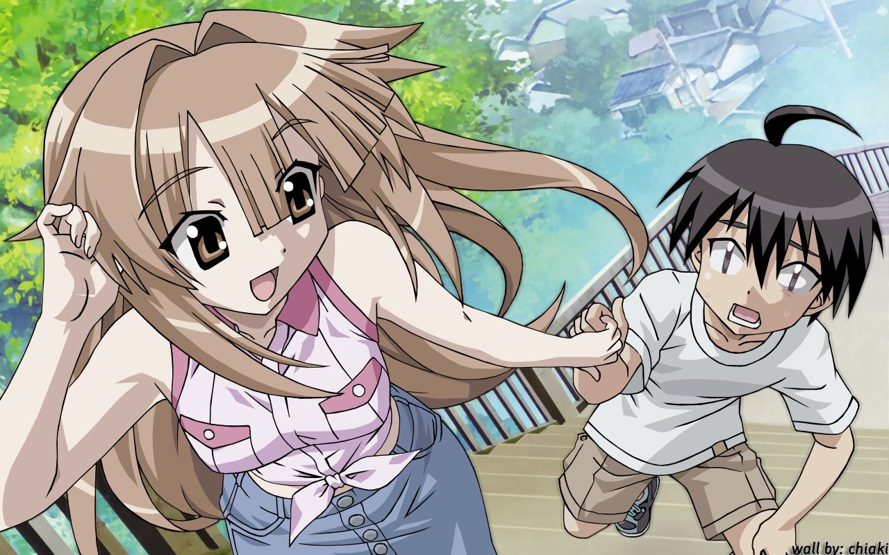 Description: A couple of anime characters are playing with each other in a park area with trees and a bench in the background.