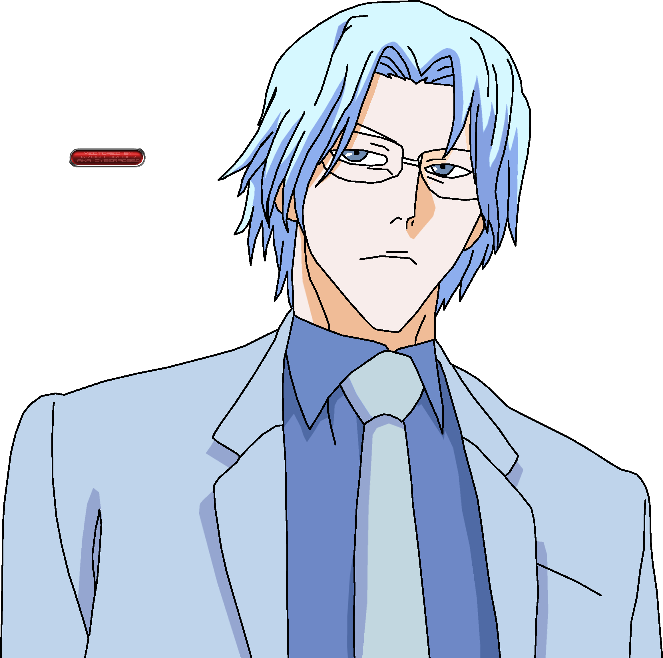 Description: A man with blue hair and glasses wearing a suit and tie with a red button up on the left side.