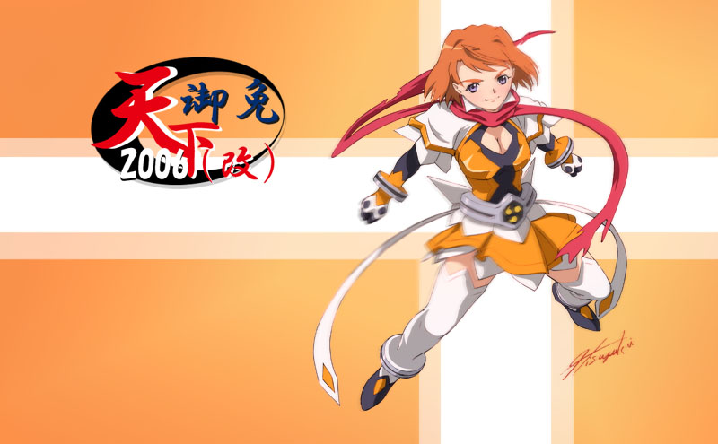 Description: A woman in a yellow and white outfit with a sword in her hand and a logo in the background.