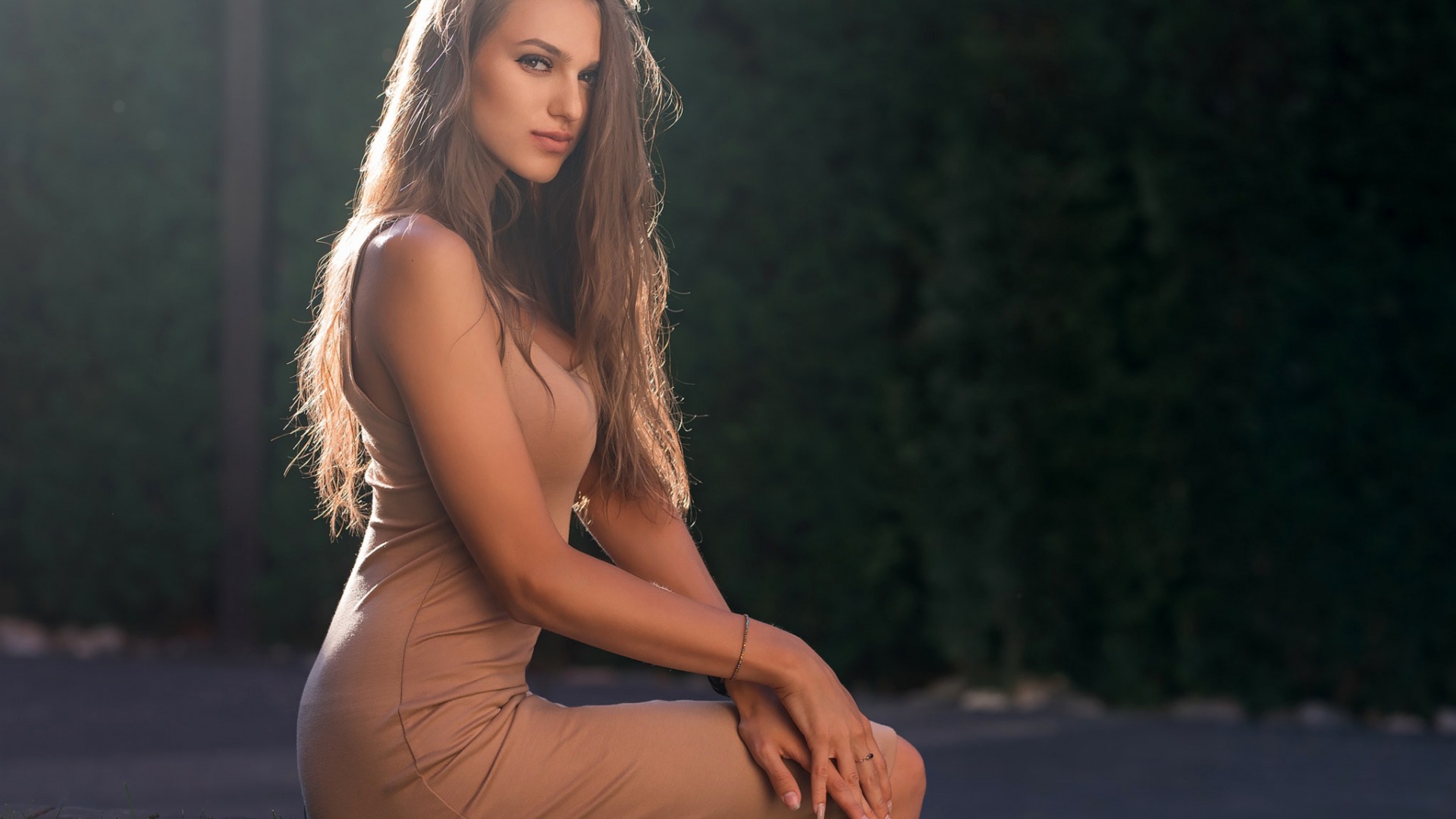 Description: A woman in a tan dress sitting on a bench with her legs crossed and her hand on her knee.