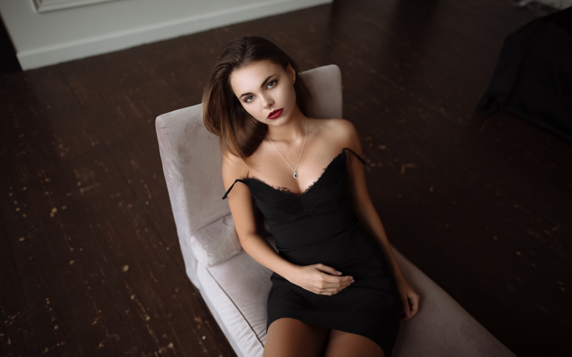 Description: A woman in a black dress sitting on a white couch with her legs crossed and her hand on her hip.