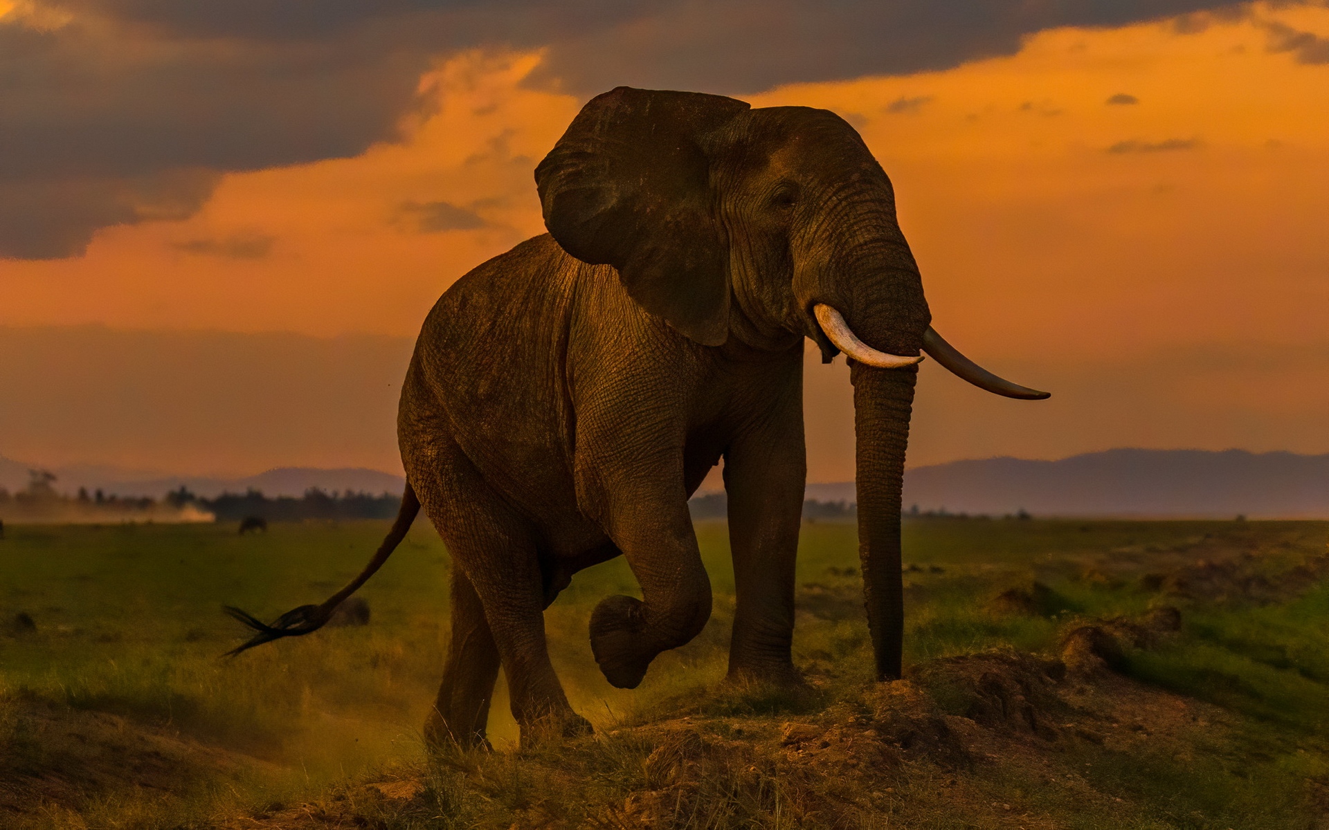 Description: A large elephant walking across a lush green field under a cloudy sky at sunset with a few clouds in the sky.