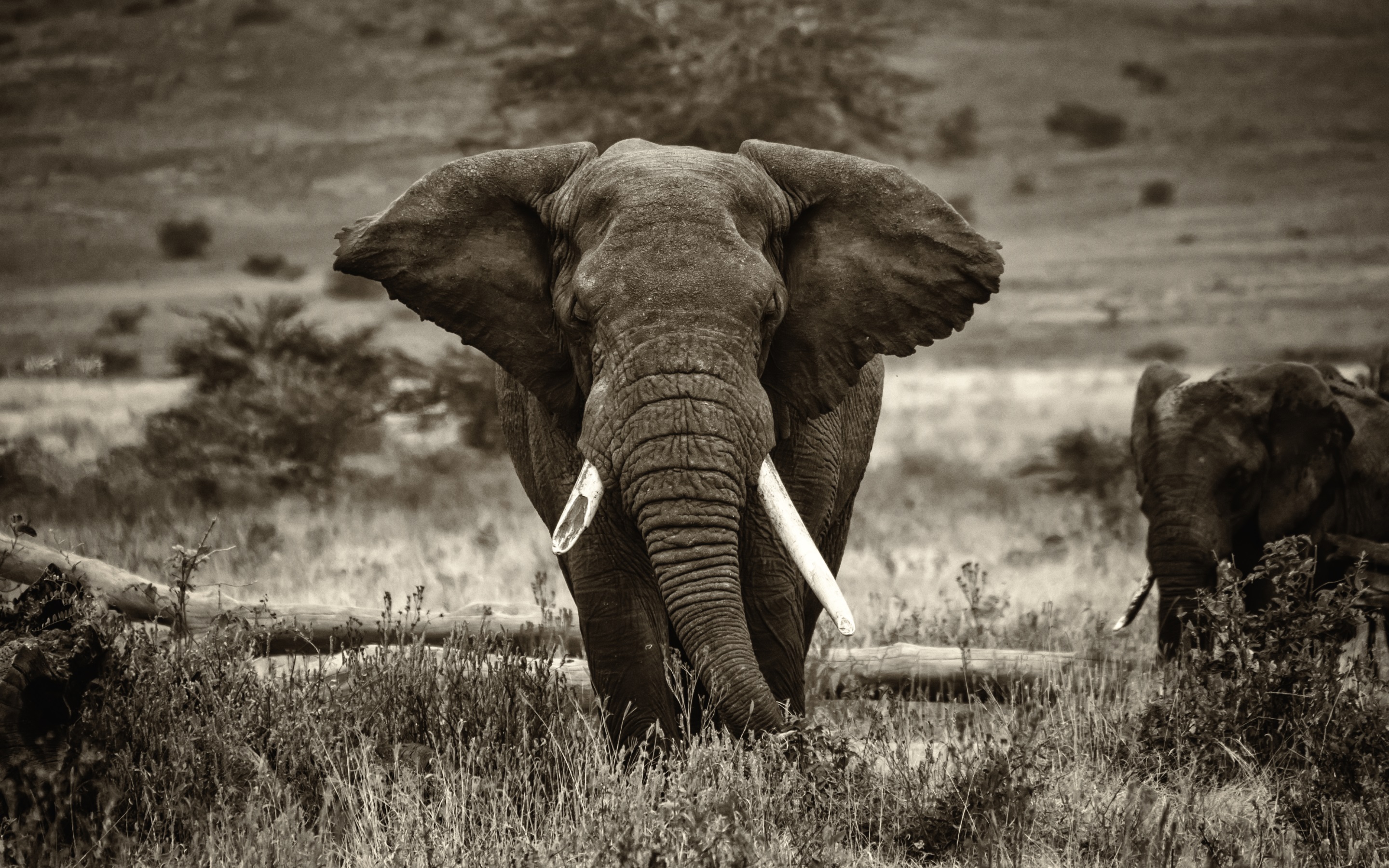 Description: A large elephant walking through a lush green field next to a forest filled with trees and bushes on a cloudy day.