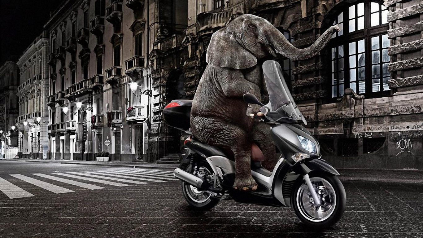 Description: An elephant riding on the back of a motorcycle on a city street at night with a street light in the background.