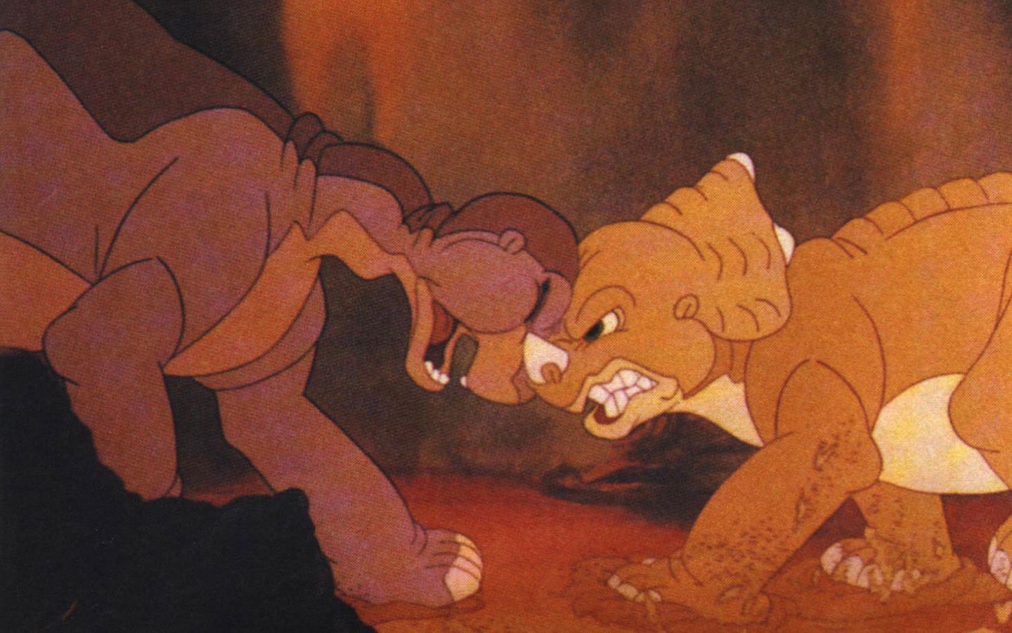 Description: A cartoon of two elephants fighting each other in a cave with a fire in the background and a cave door in the background.