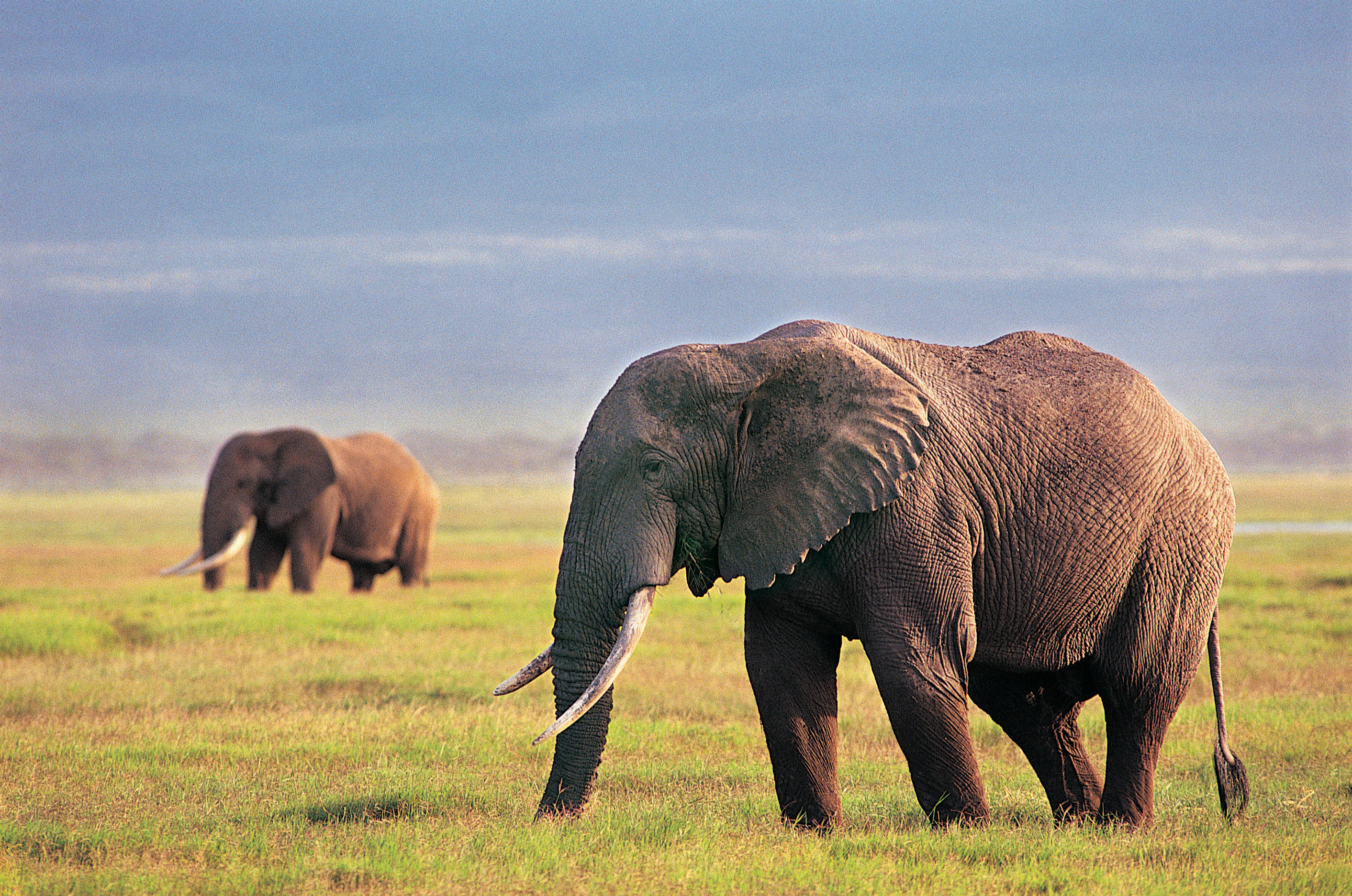 Description: Two elephants walking in a grassy field with a sky background and clouds in the distance.