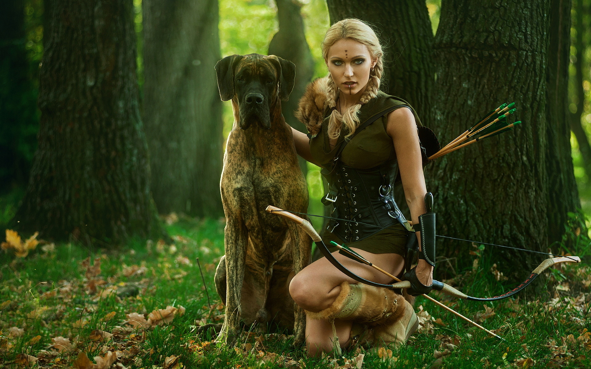 Description: A woman with a bow and a dog in the woods with arrows in her hands and a bow in her hand.