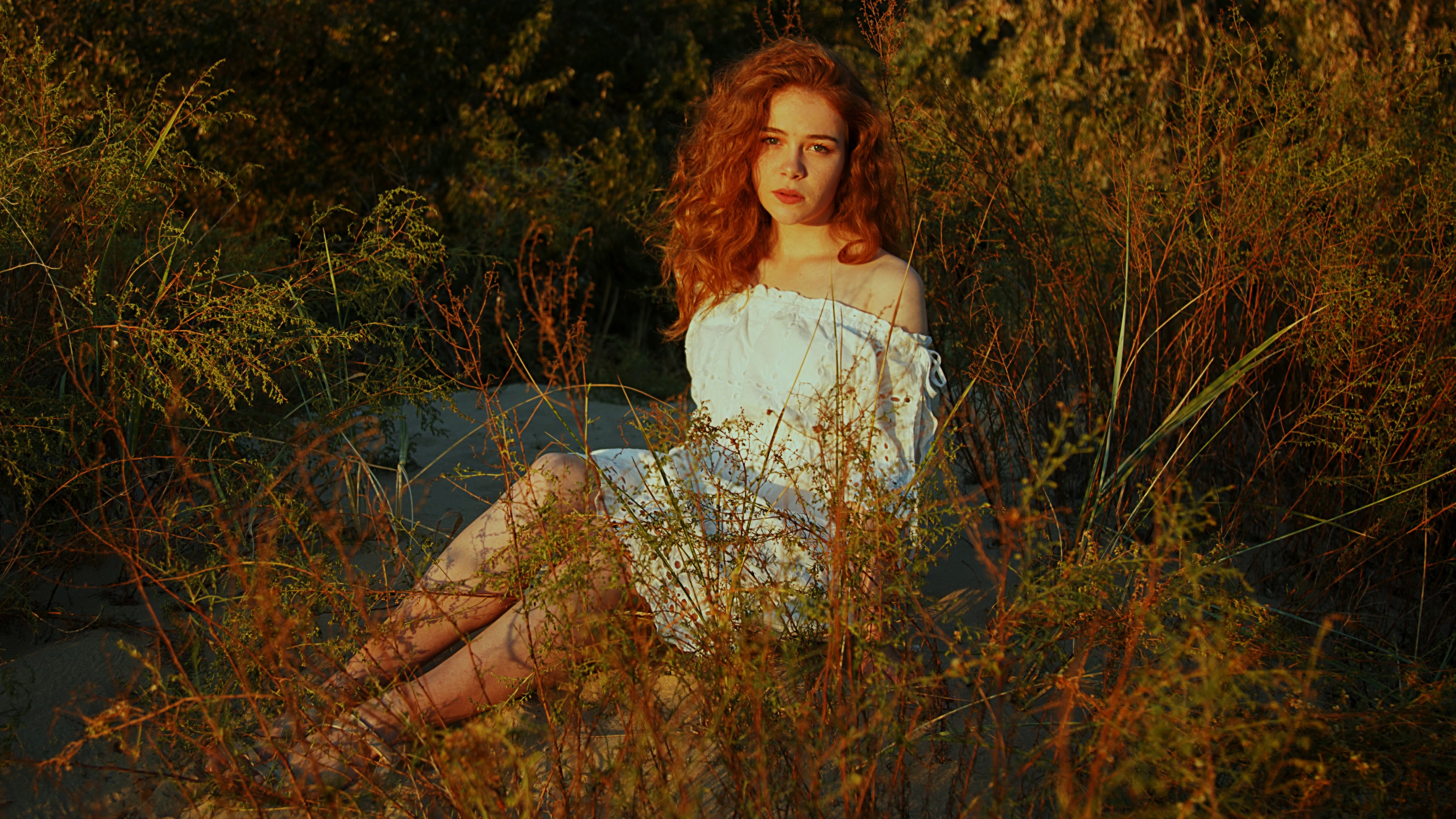 Description: A woman sitting in a field of tall grass and weeds.