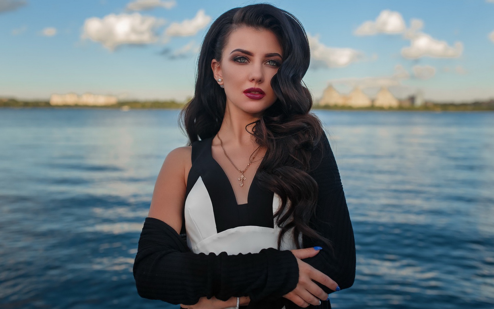 Description: A woman with long hair standing in front of a body of water with her arms crossed and her hand on her hip.