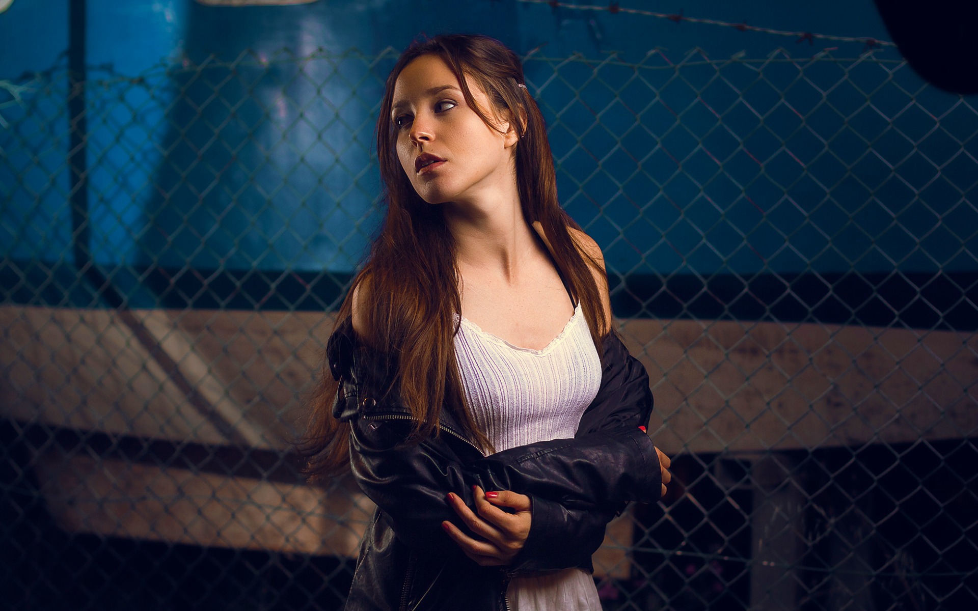 Description: A woman standing in front of a fence with her arms crossed and looking up at something in the distance.