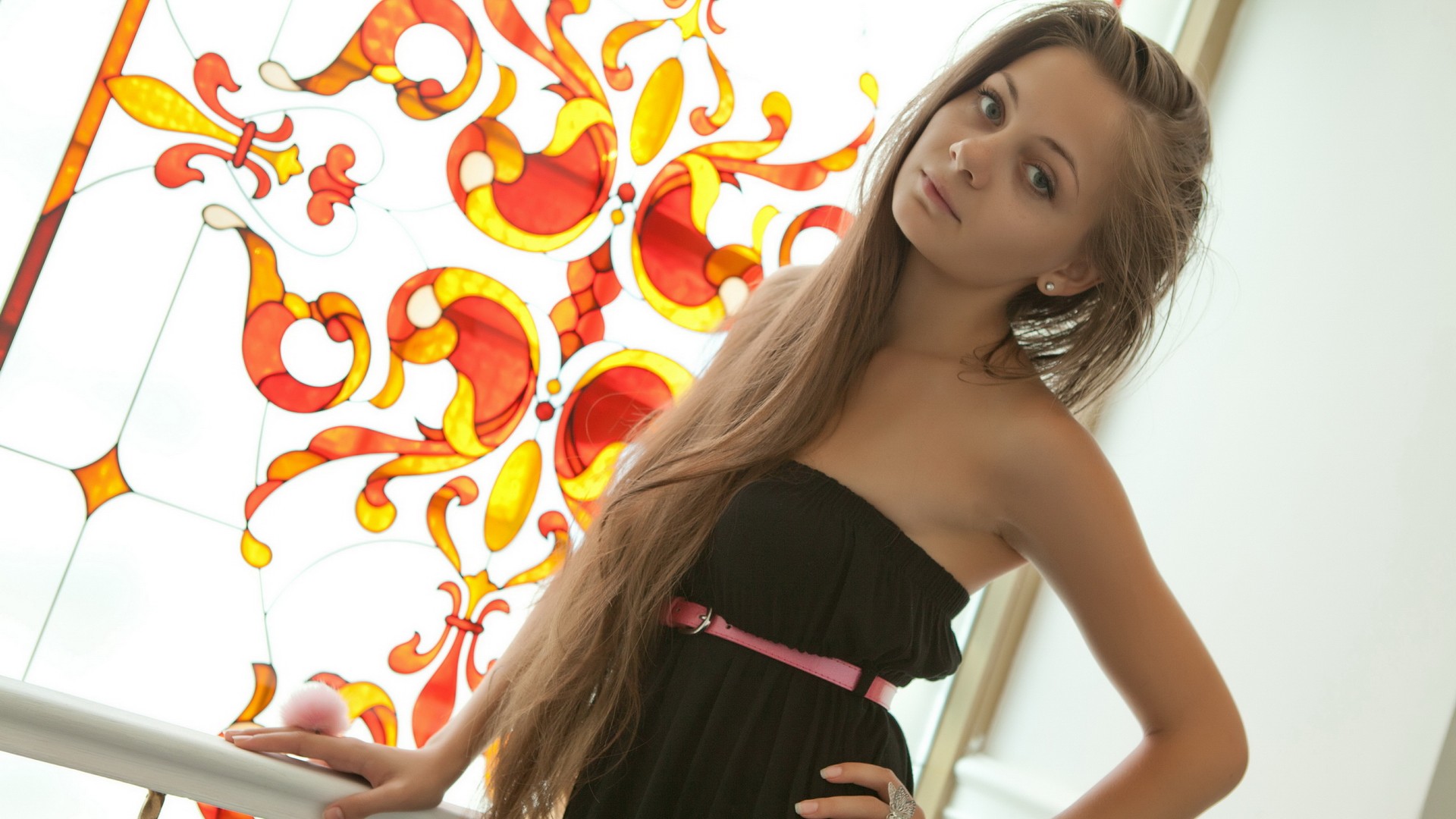 Description: A woman in a black dress standing next to a window with a red and yellow design on it's glass.