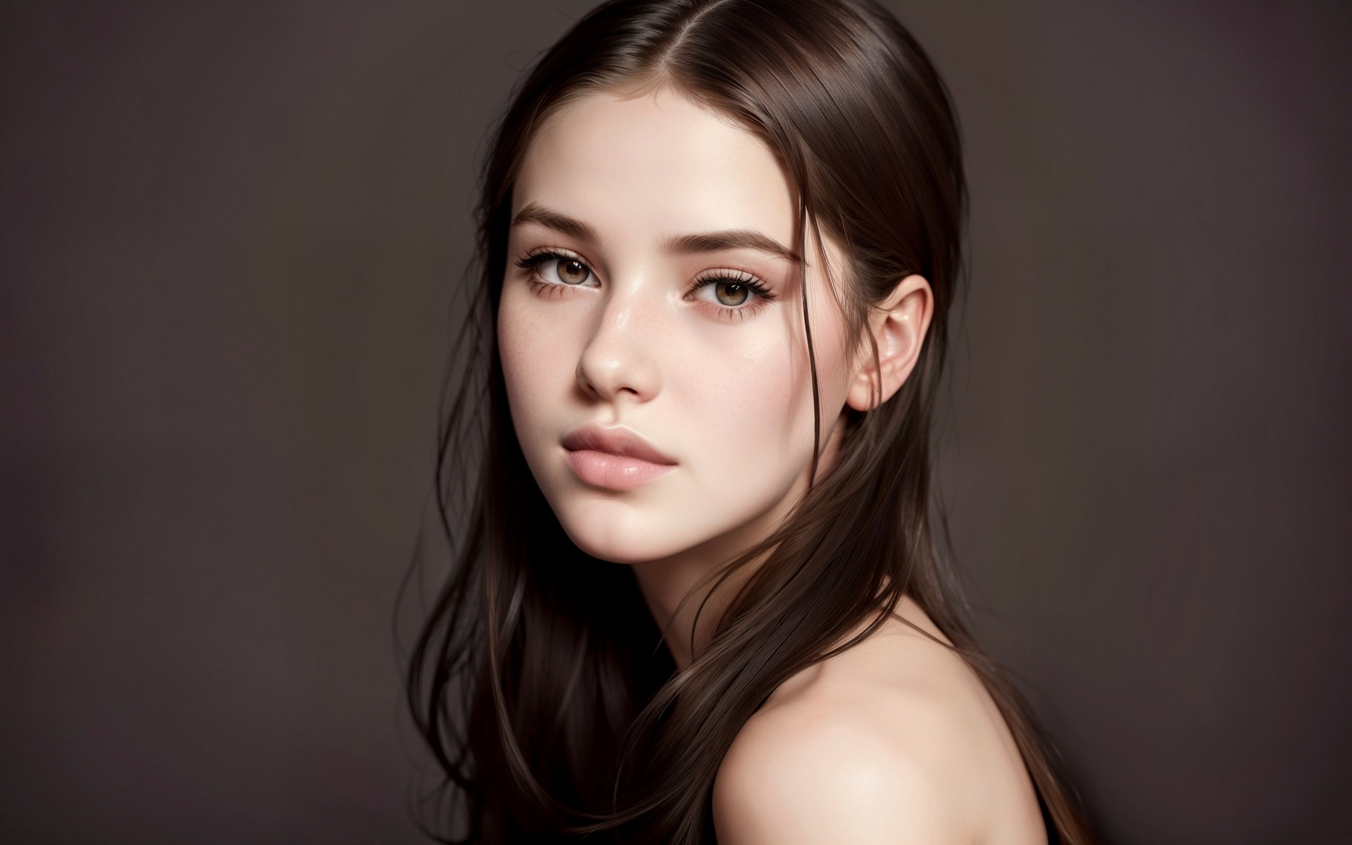 Description: A woman with long hair and a black dress is posing for a picture with her eyes closed and her hair in a ponytail.