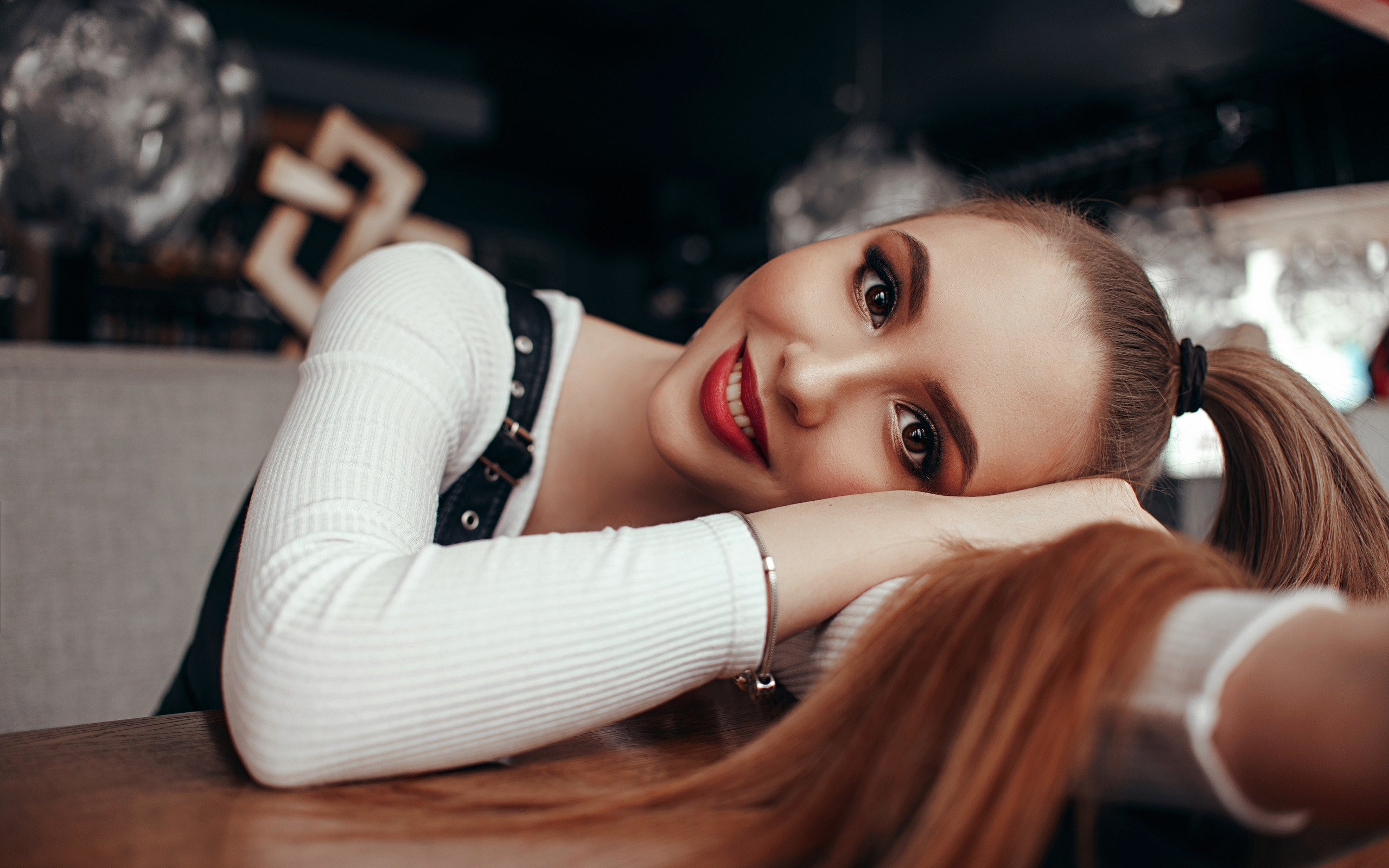 Description: A woman with long hair sitting at a table with her hand on her head and looking at the camera.
