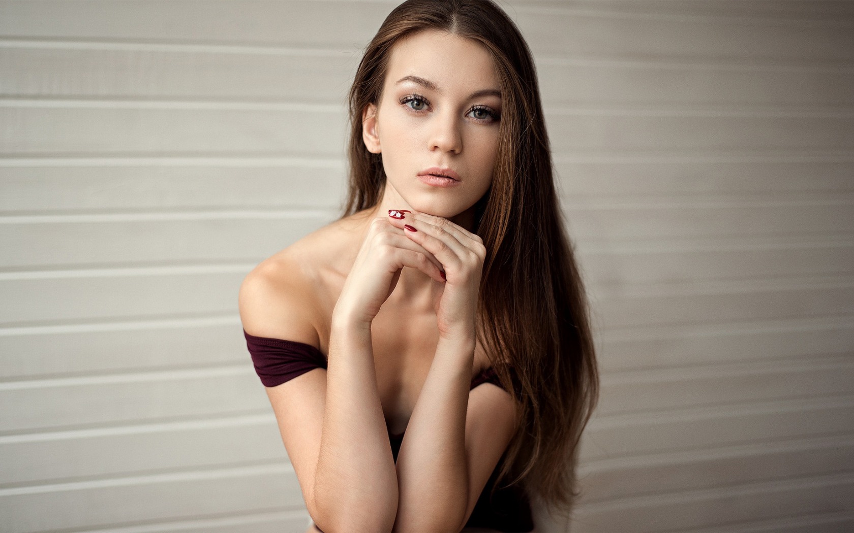 Description: A woman with long hair posing for a picture with her hands on her chest and her hand on her chest.