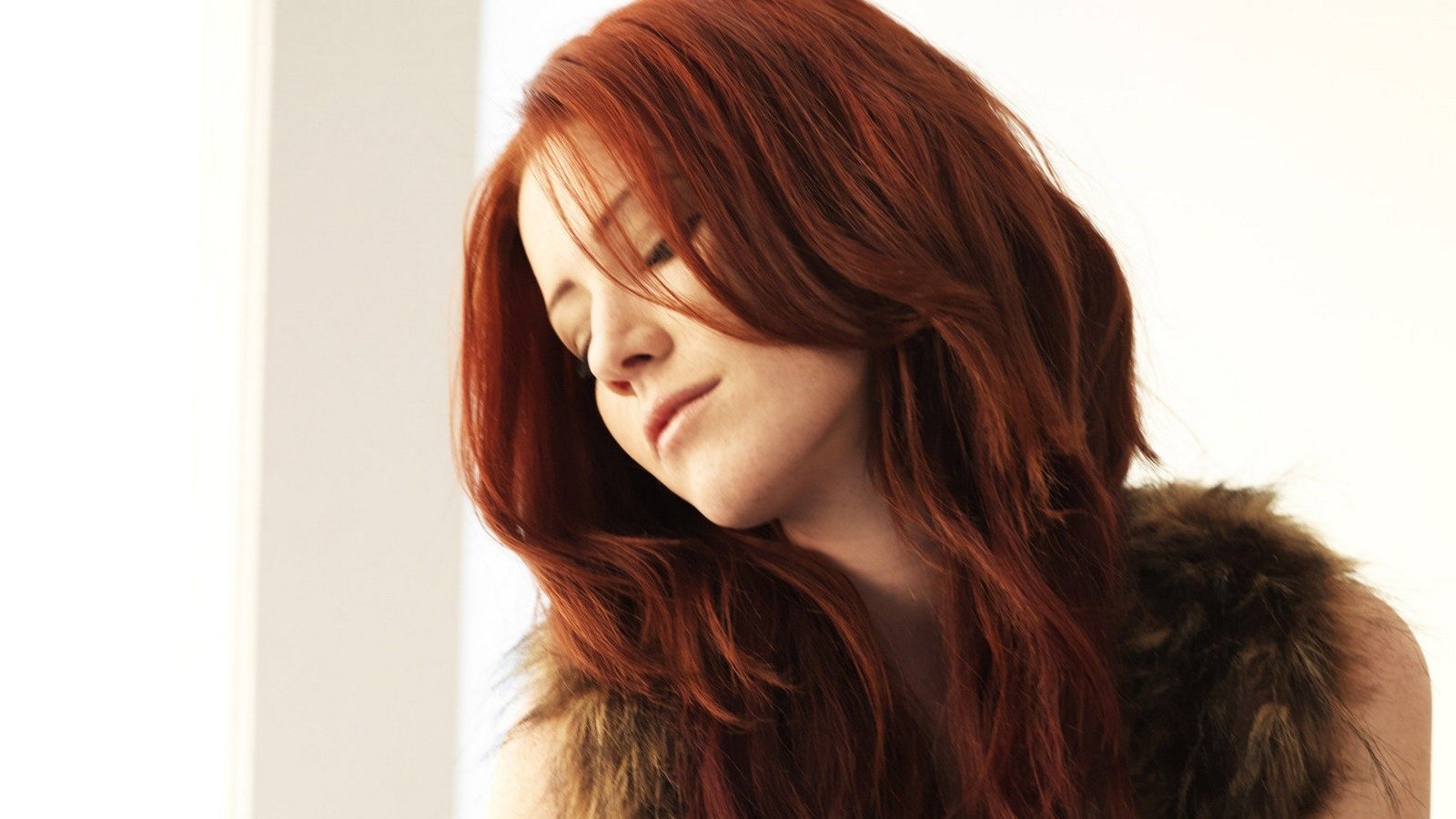 Description: A woman with red hair and a fur vest on looking down at her cell phone while she is holding her head.