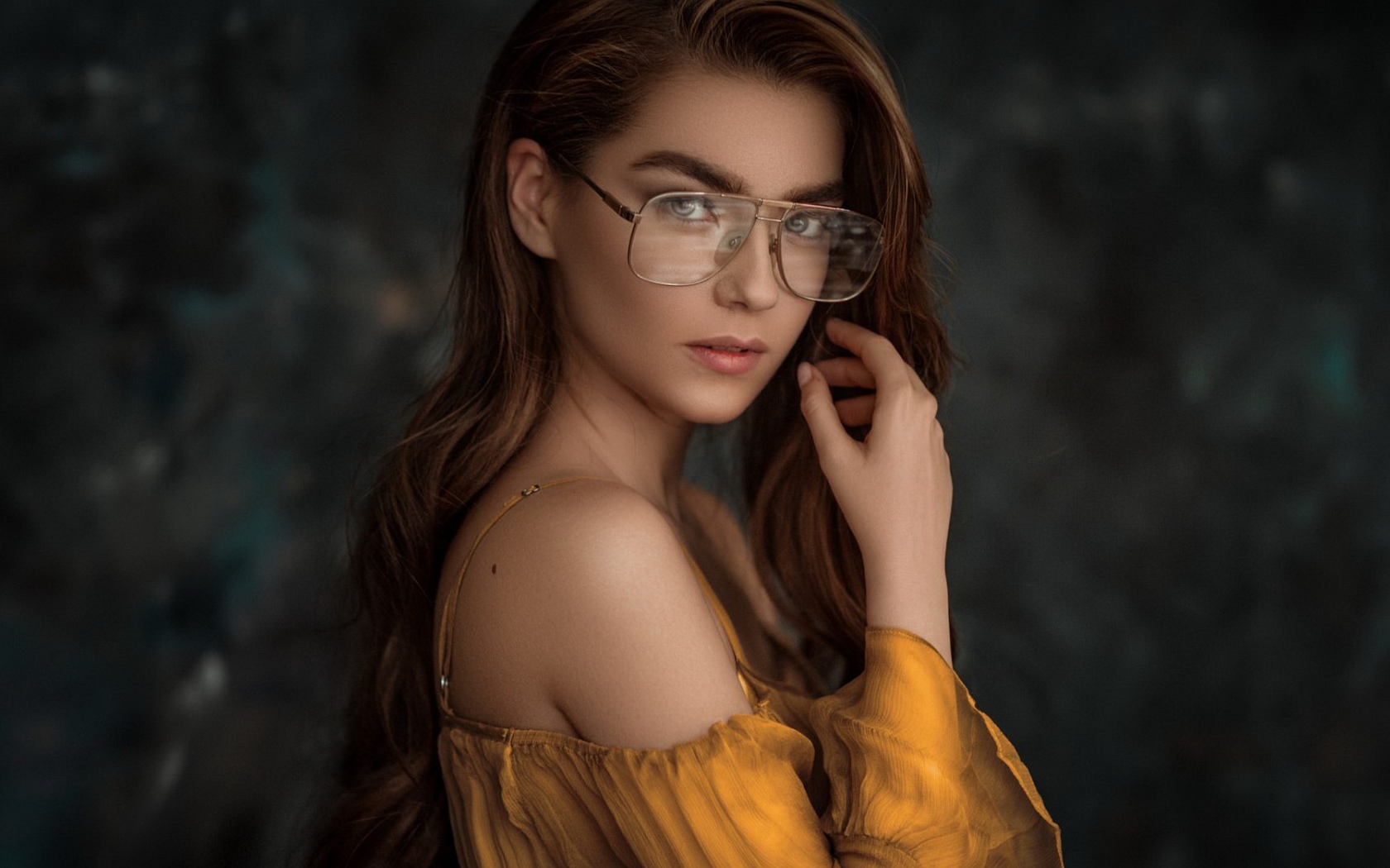 Description: A woman wearing glasses posing for a picture with her hand on her head and her right arm behind her head.