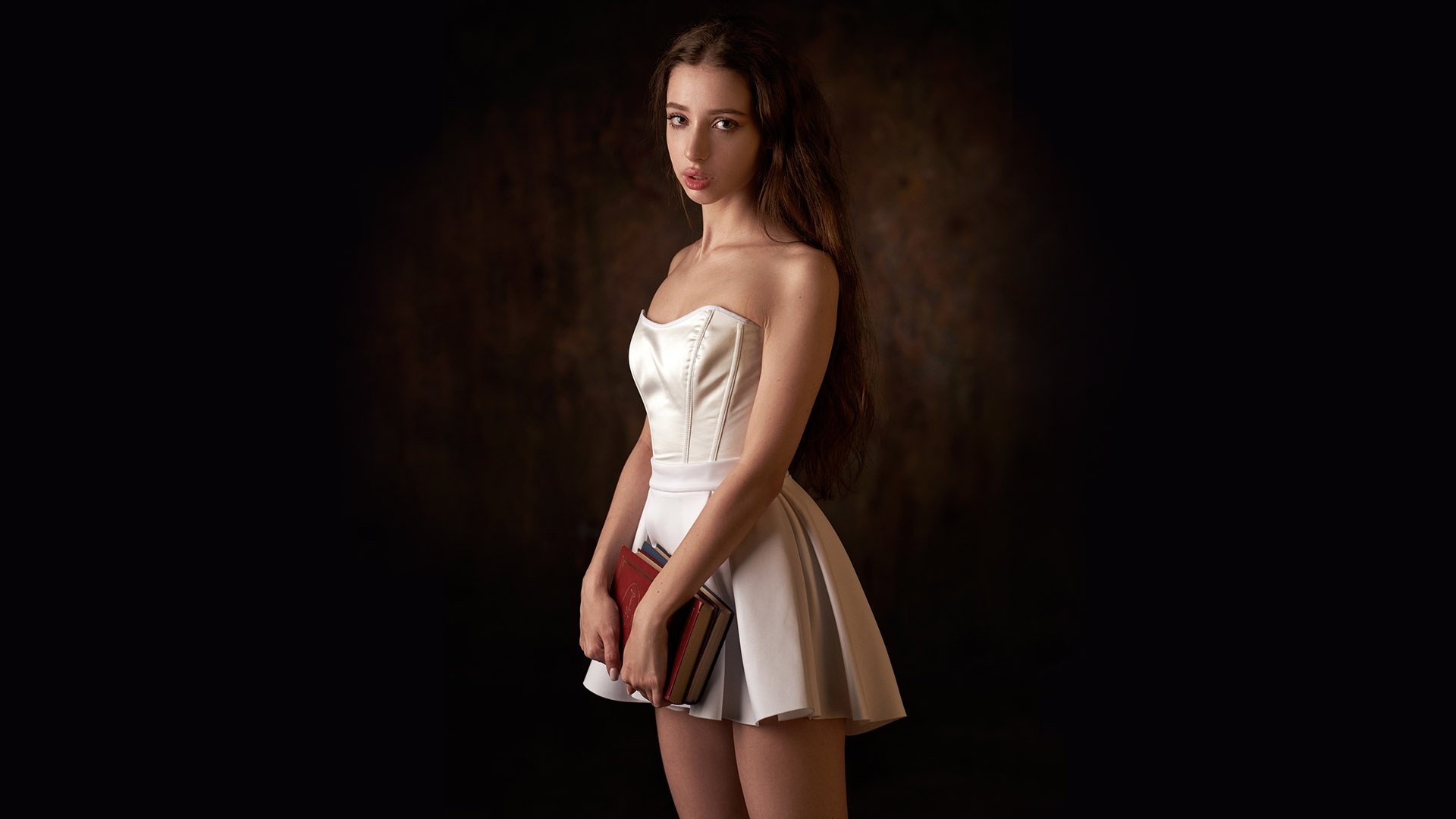 Description: A woman in a short white dress holding a purse and posing for a picture in a dark room with a dark background.