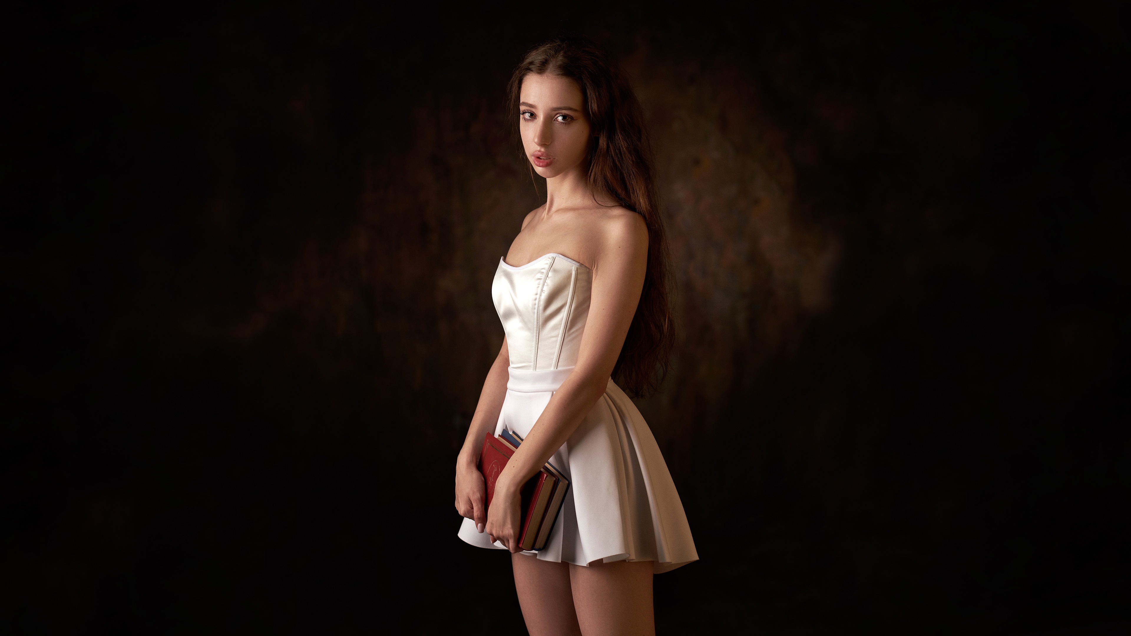 Description: A woman in a short white dress holding a purse and posing for a picture in a dark room with a dark background.