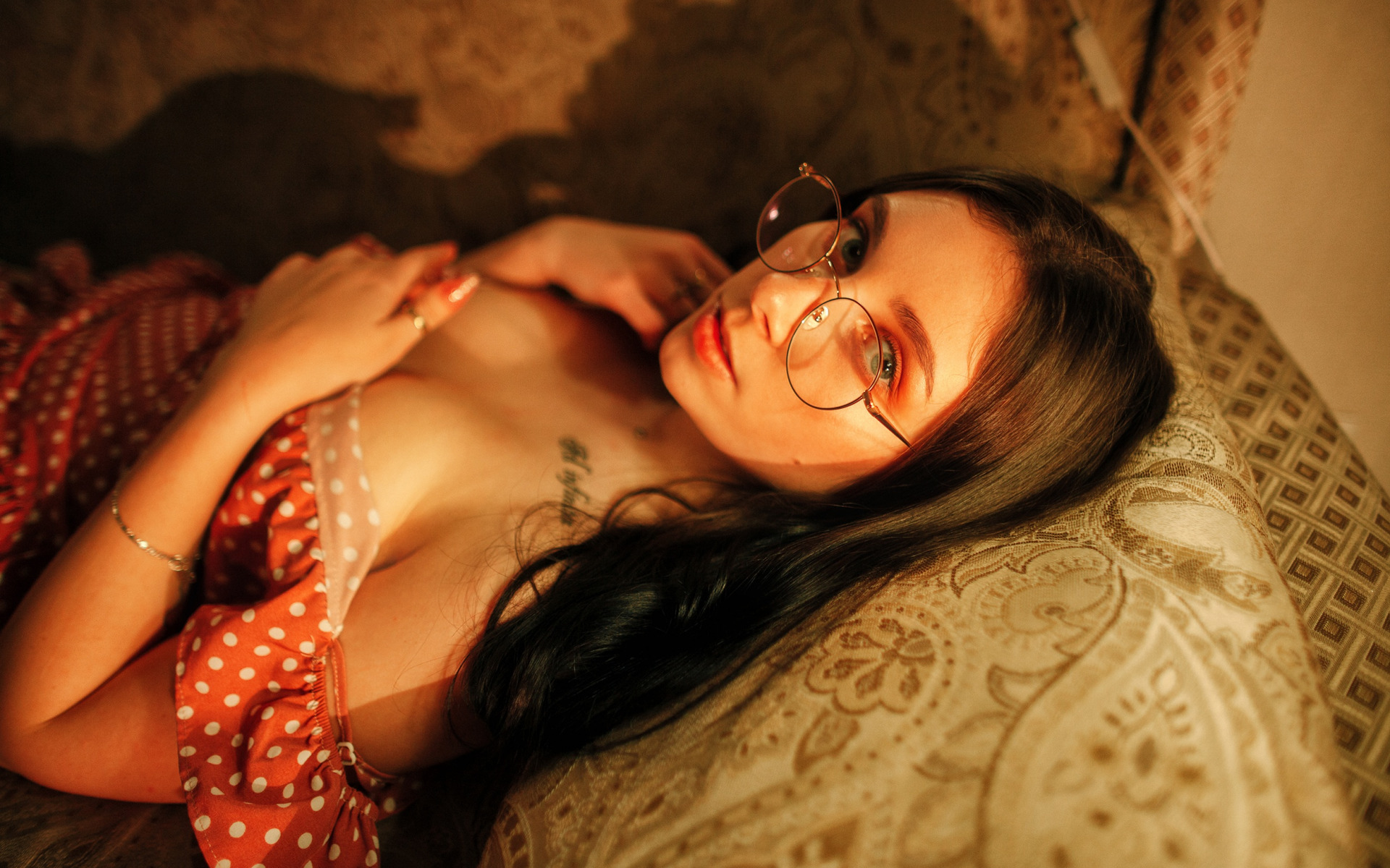 Description: A woman with glasses laying on a bed with a polka dot dress and a polka dot shirt on her chest.