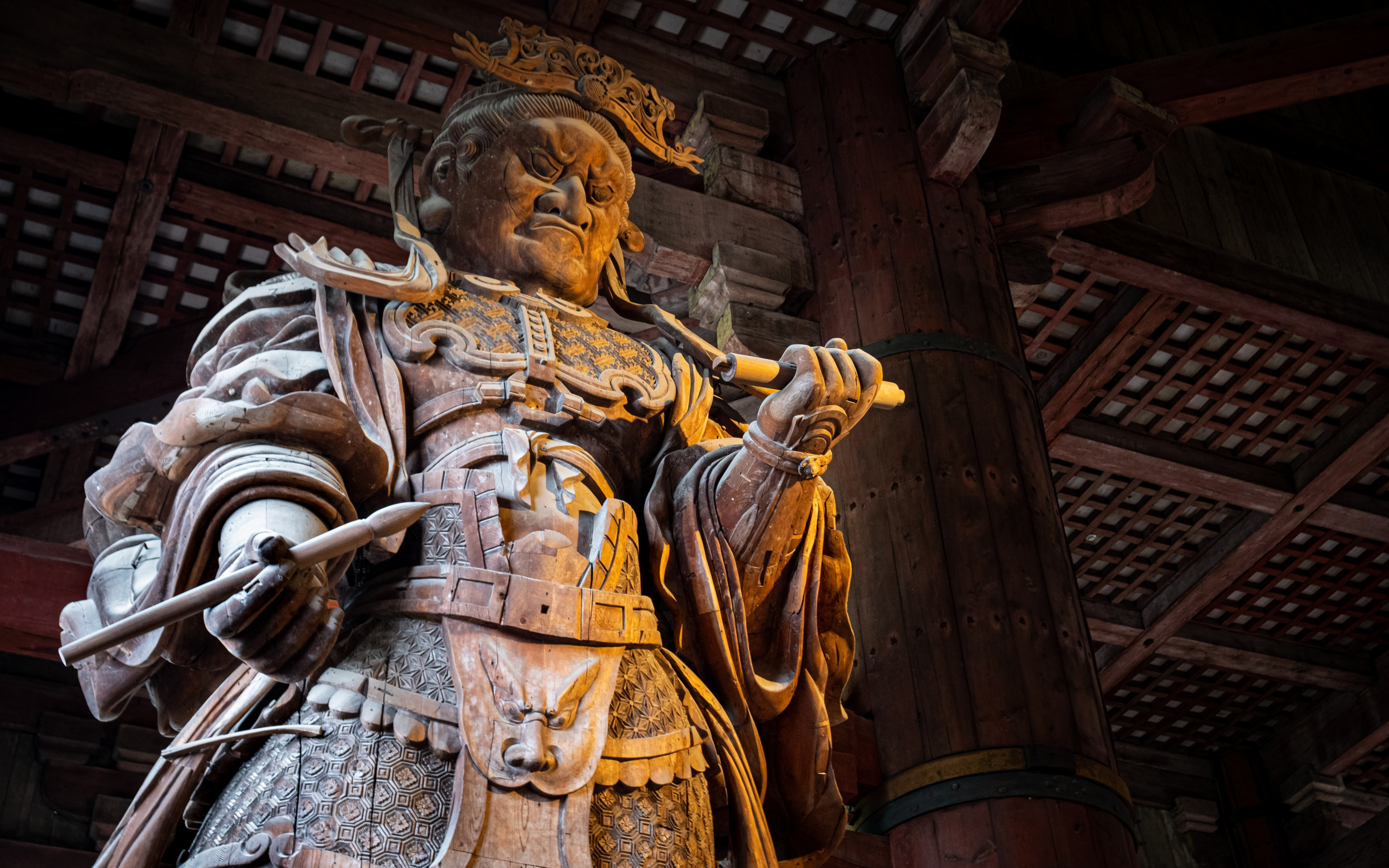 Description: A statue of a man holding a sword in a building with a wooden ceiling and a wooden ceiling in the background.