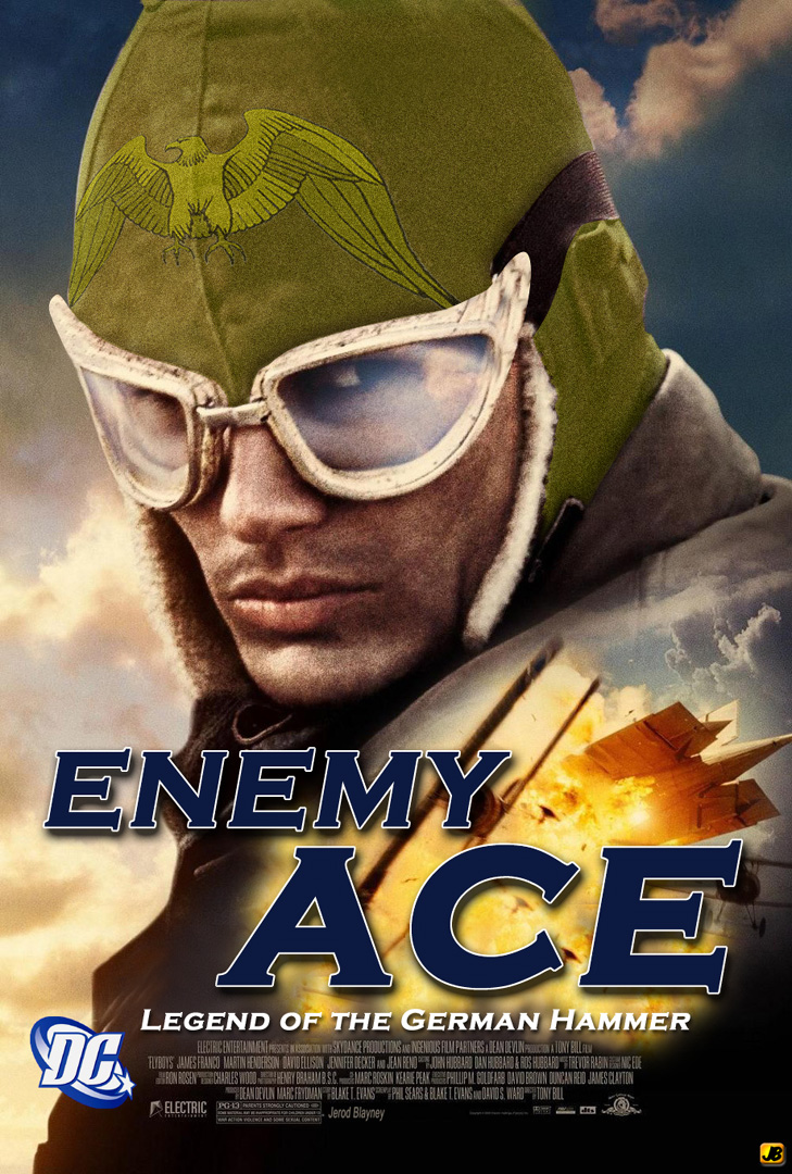 Description: A movie poster for enemy ace with a man in a green hat and sunglasses holding a gun and a gun.